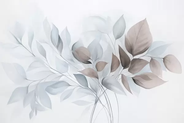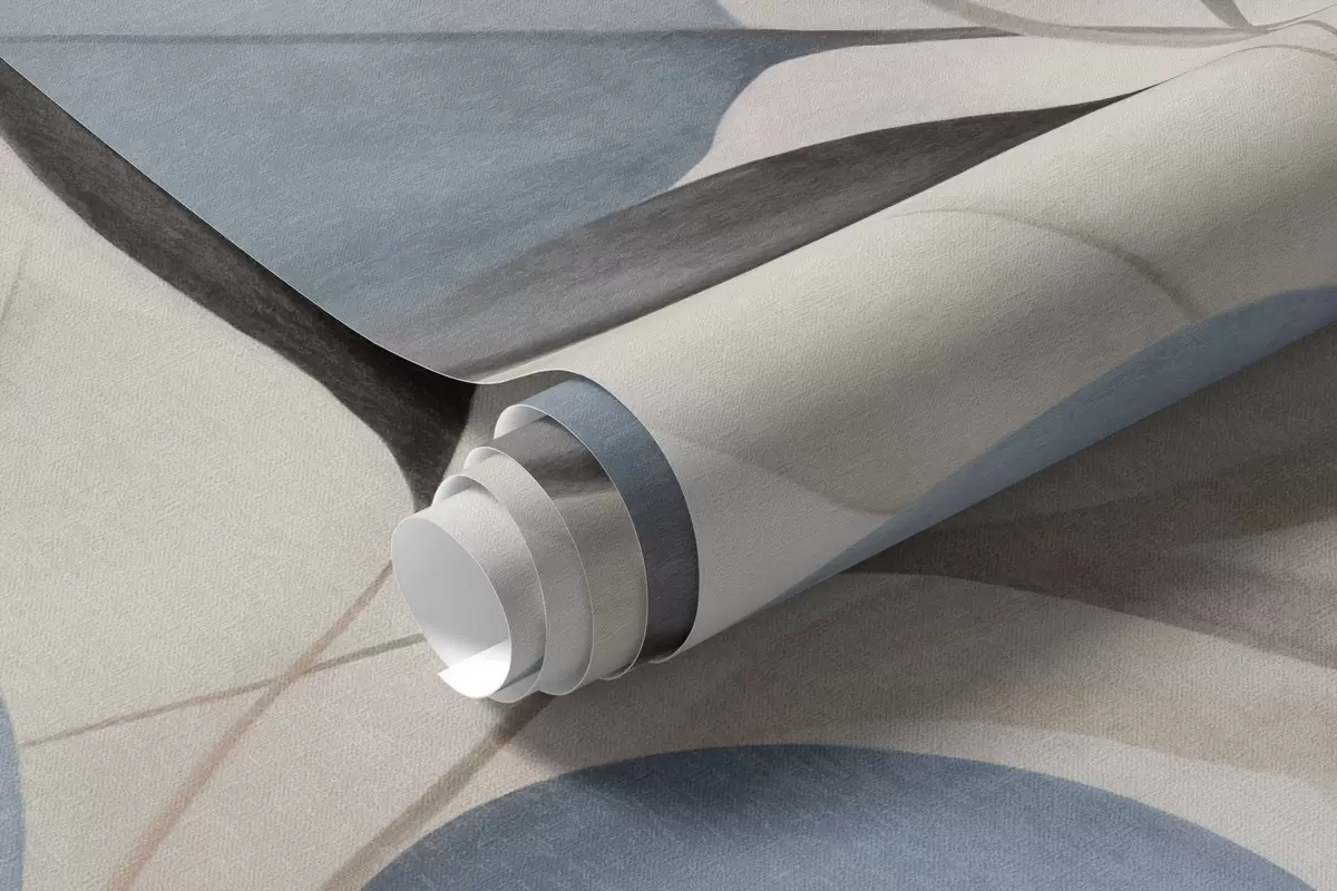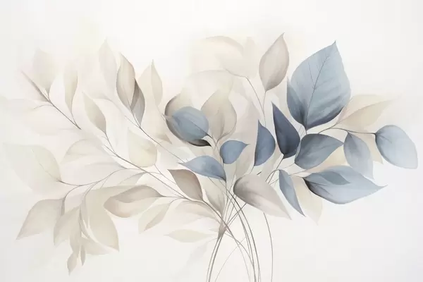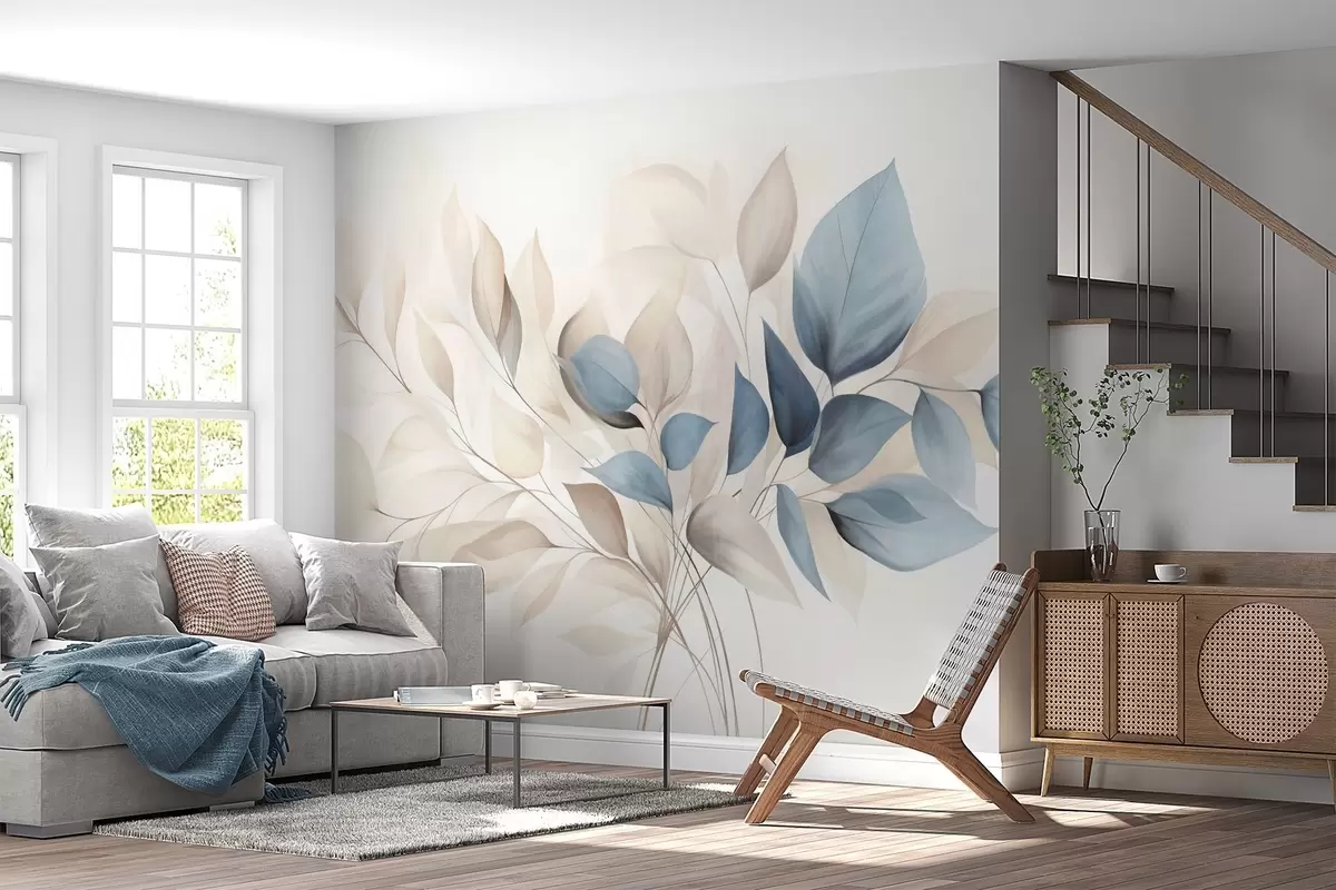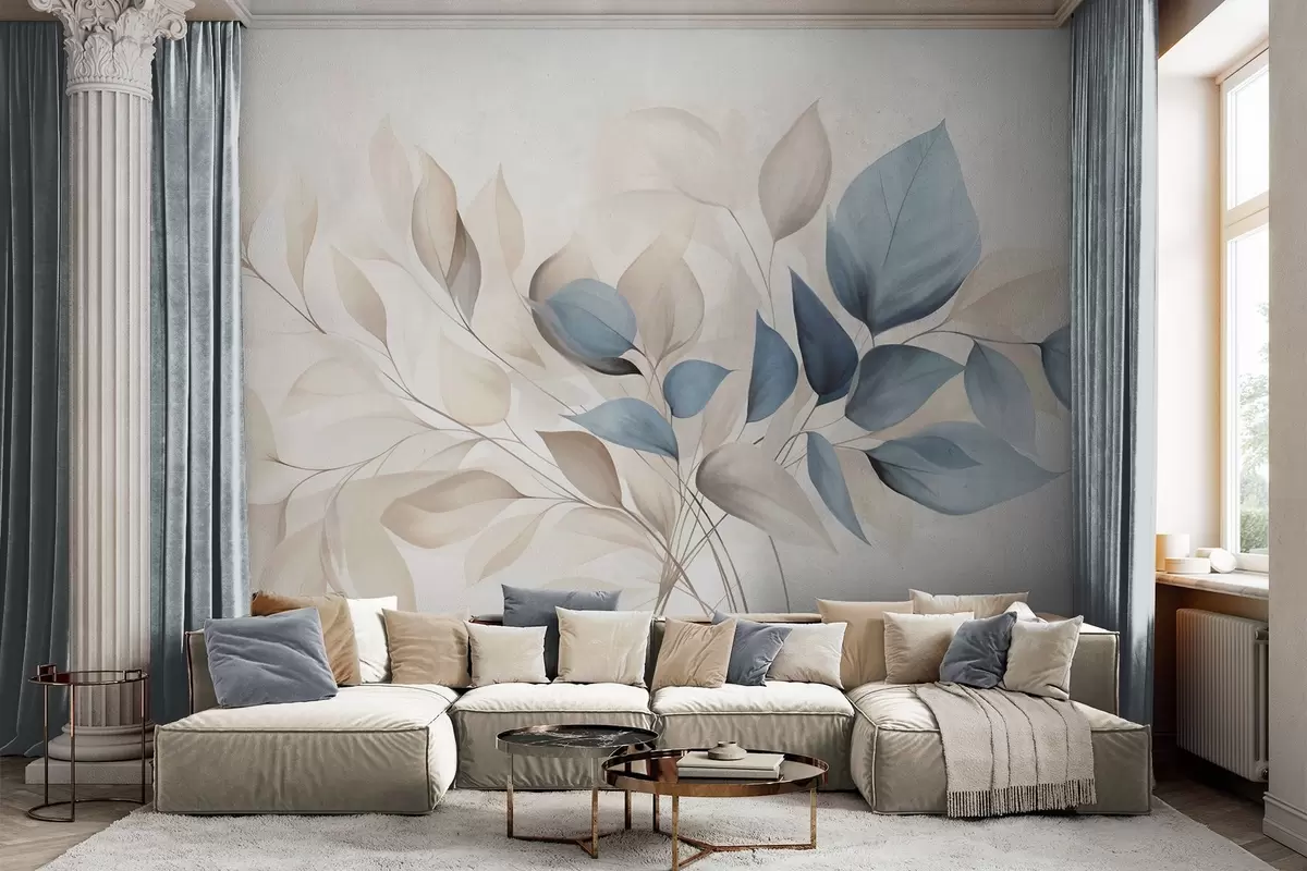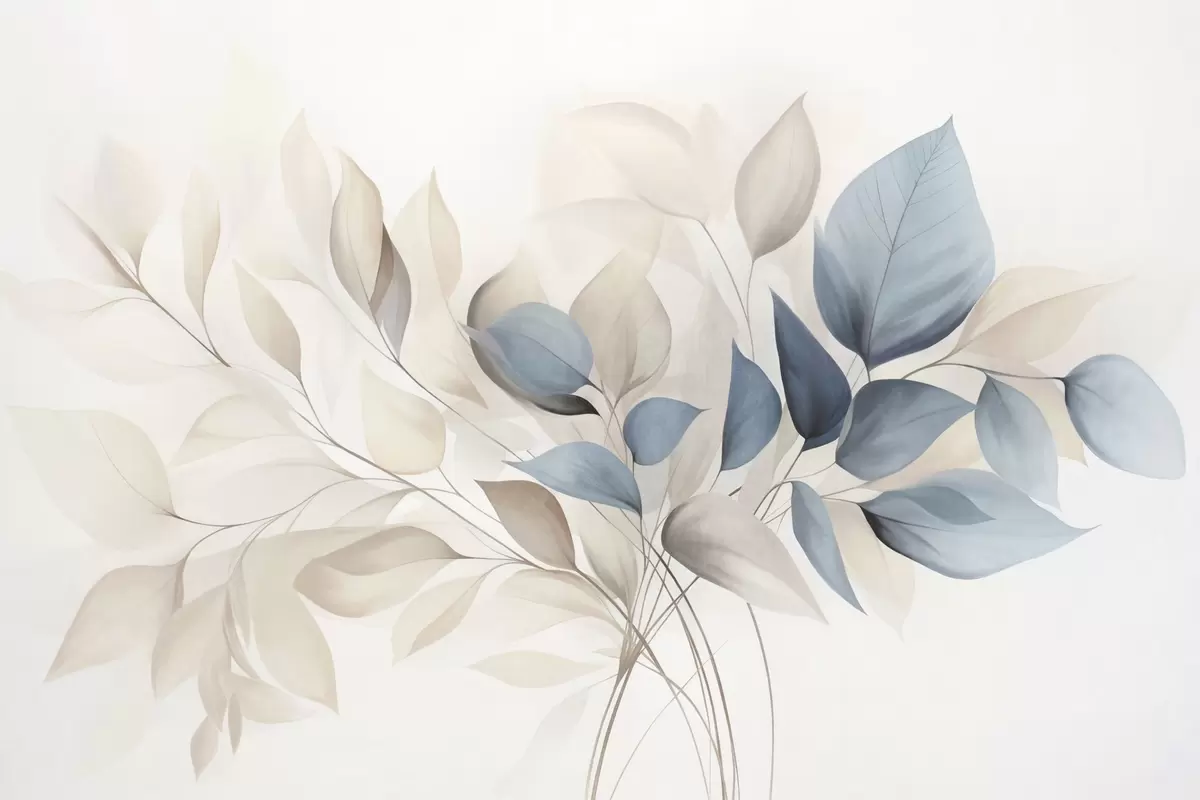 Fotobehang Abstracte doorschijnende bladeren in blauw-, beige- en crèmekleuren, kunst met textuur N° w09744