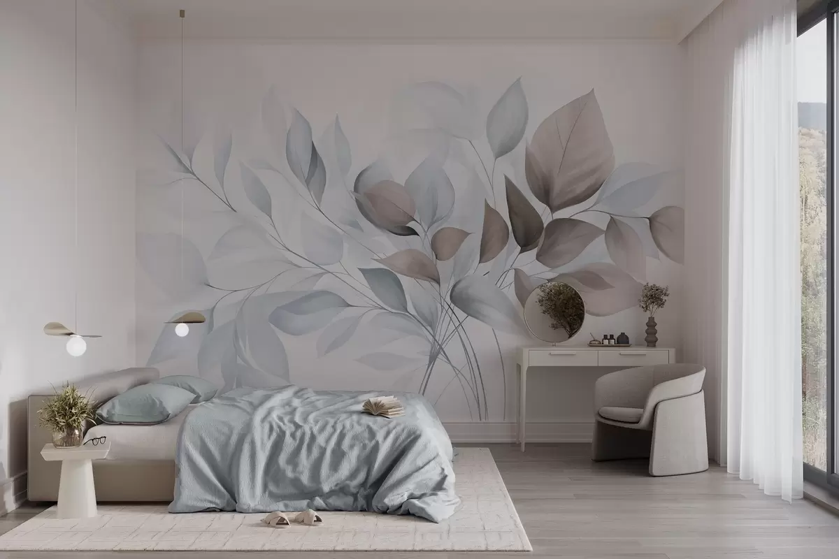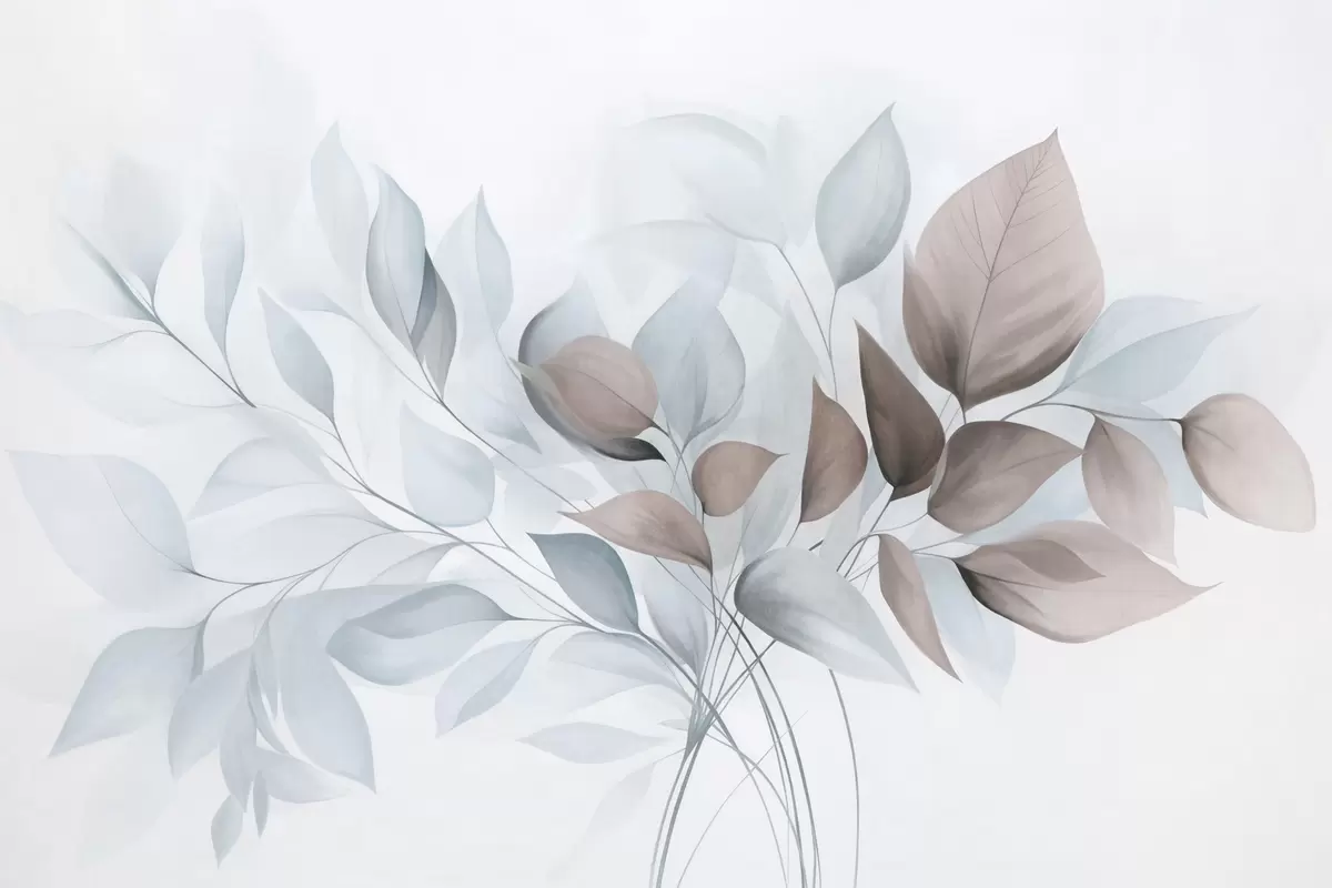 Fotobehang Abstracte doorschijnende bladeren in blauw-, beige- en bruintinten, kunst met textuur N° w09744v1