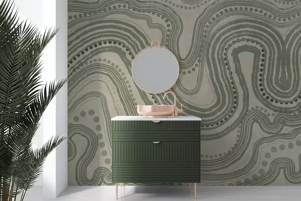 Fotobehang Abstracte groene en beige golvende lijnen en stippen, moderne kunst met textuur N° w09747
