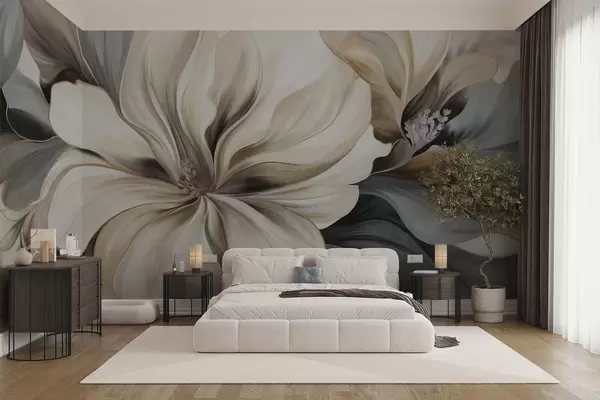Fotobehang Grote, crèmekleurige magnoliabloemen met bruine en grijze bladeren, zachte verlichting, abstracte achtergrond N° w09749
