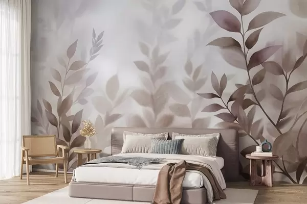 Fotobehang Delicate takken met gedempte bruine en beige bladeren, aquarelstijl, kunst met textuur N° w09750