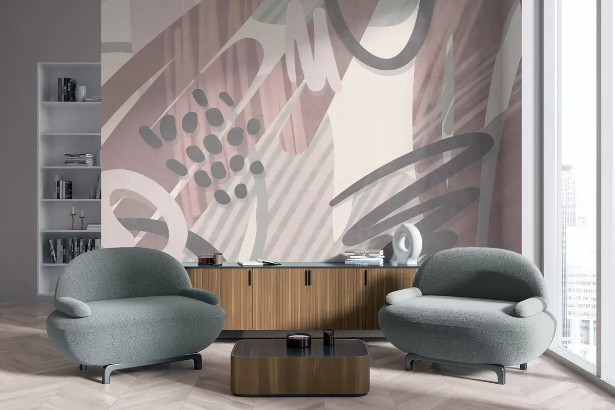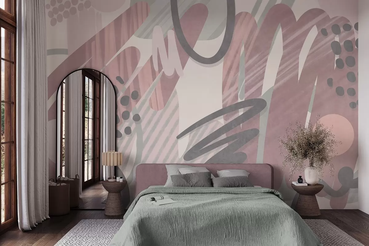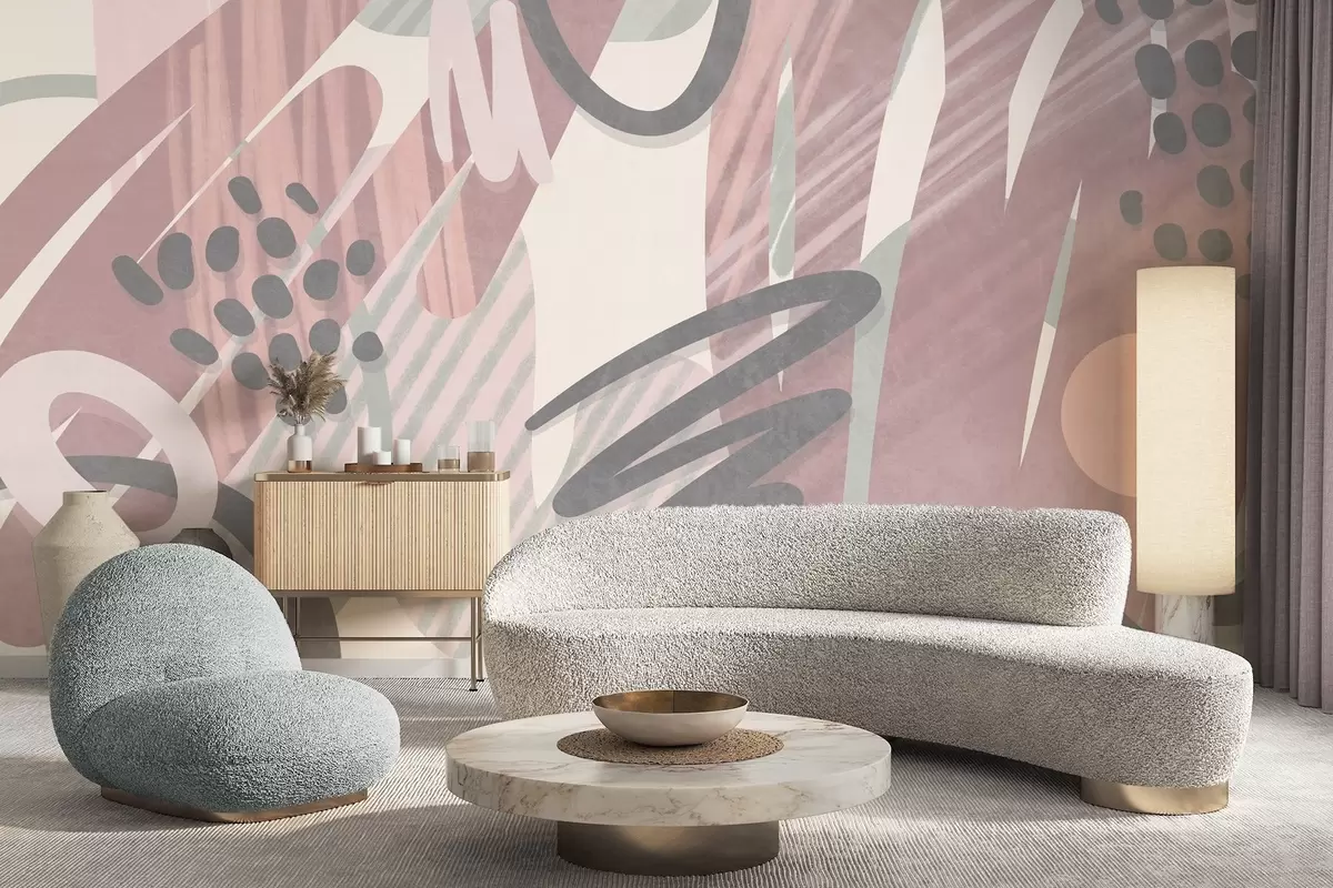 Fotobehang Abstracte print met textuur, bestaande uit organische vormen, krabbels en stippen in zachte pasteltinten N° w09774v1