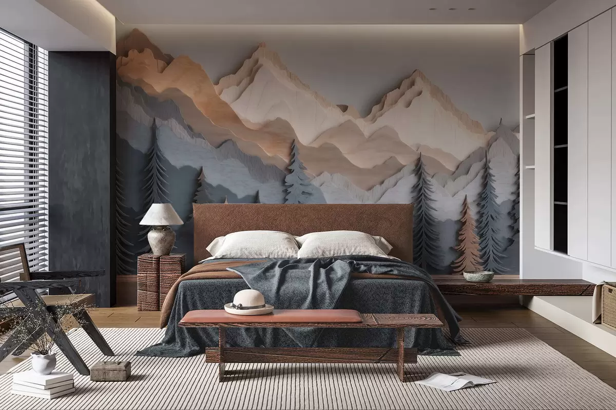 Fotobehang Natuurlandschap met dennenbomen en bergen in houtsnijwerkstijl N° w09793