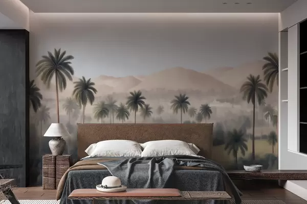 Fotobehang Tropisch landschap met palmbomen en bergen, vintage panorama in beige en groene tinten N° w09798
