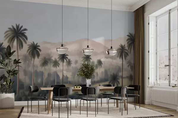 Fotobehang Tropisch landschap met palmbomen en bergen, vintage panorama in beige en groene tinten N° w09798