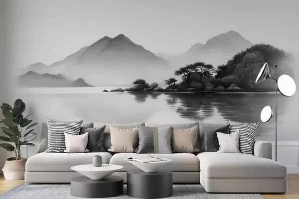 Fotobehang Zwart-wit landschap met bergen en een meer in een lichte mist N° w09803