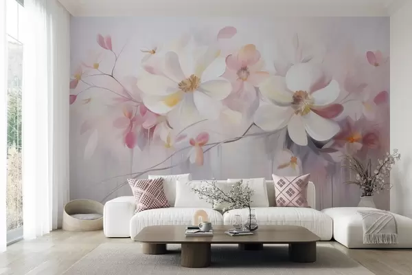 Fotobehang Witte en roze bloemen met delicate bloemblaadjes, kunst met textuur, abstract, zachte achtergrond N° w09811