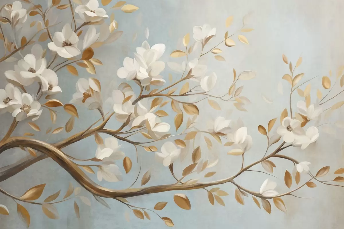 Fotobehang Een boomtak met reliëf, witte bloemen en gele bladeren, in vintage stijl N° w09814