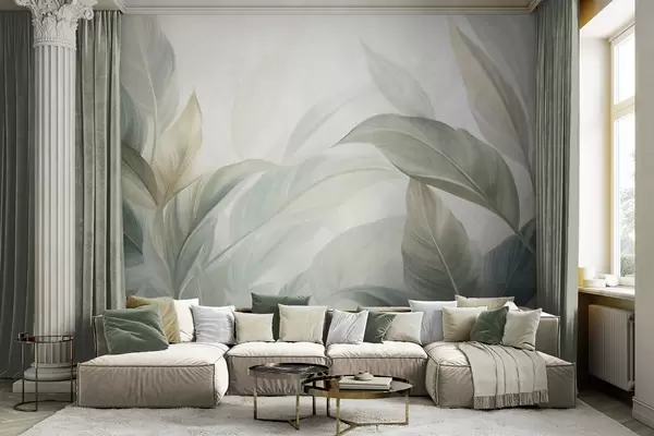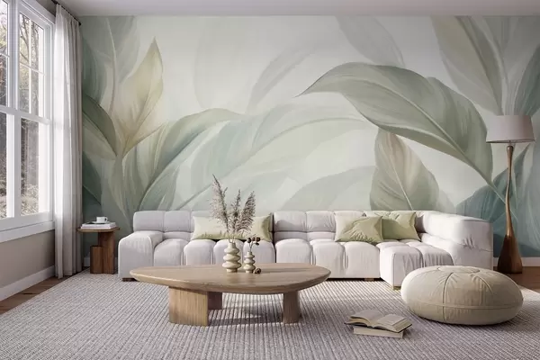 Fotobehang Grote, lichtgroene tropische bladeren met zachte pasteltinten, kunst met textuur N° w09816
