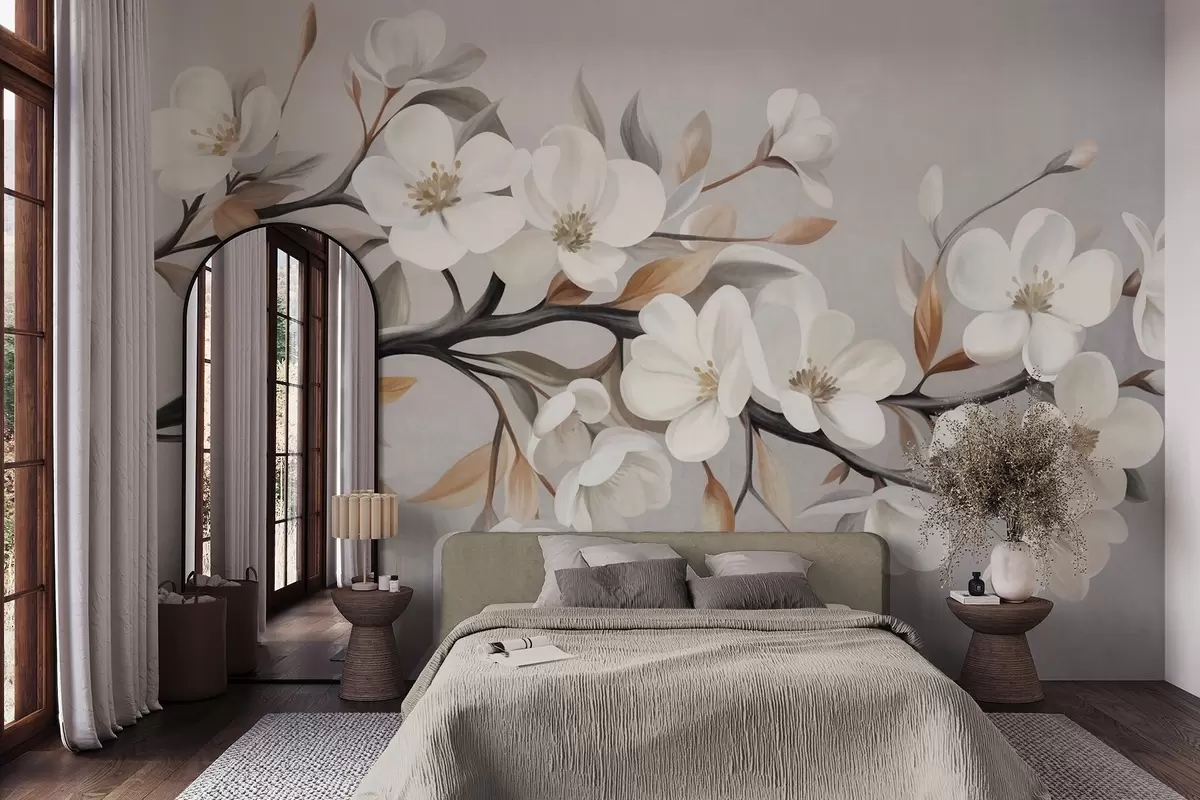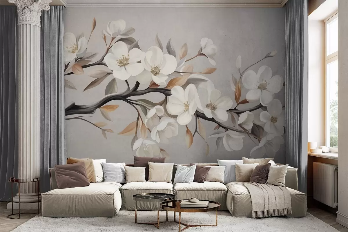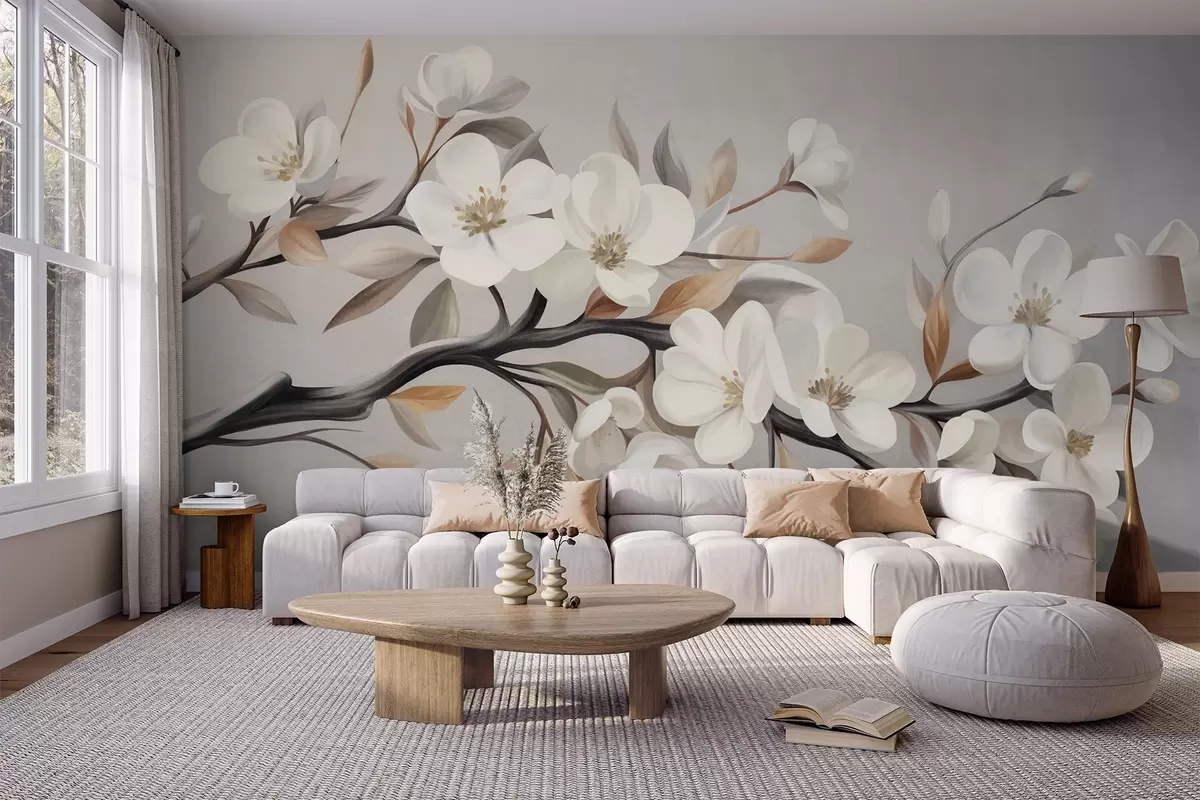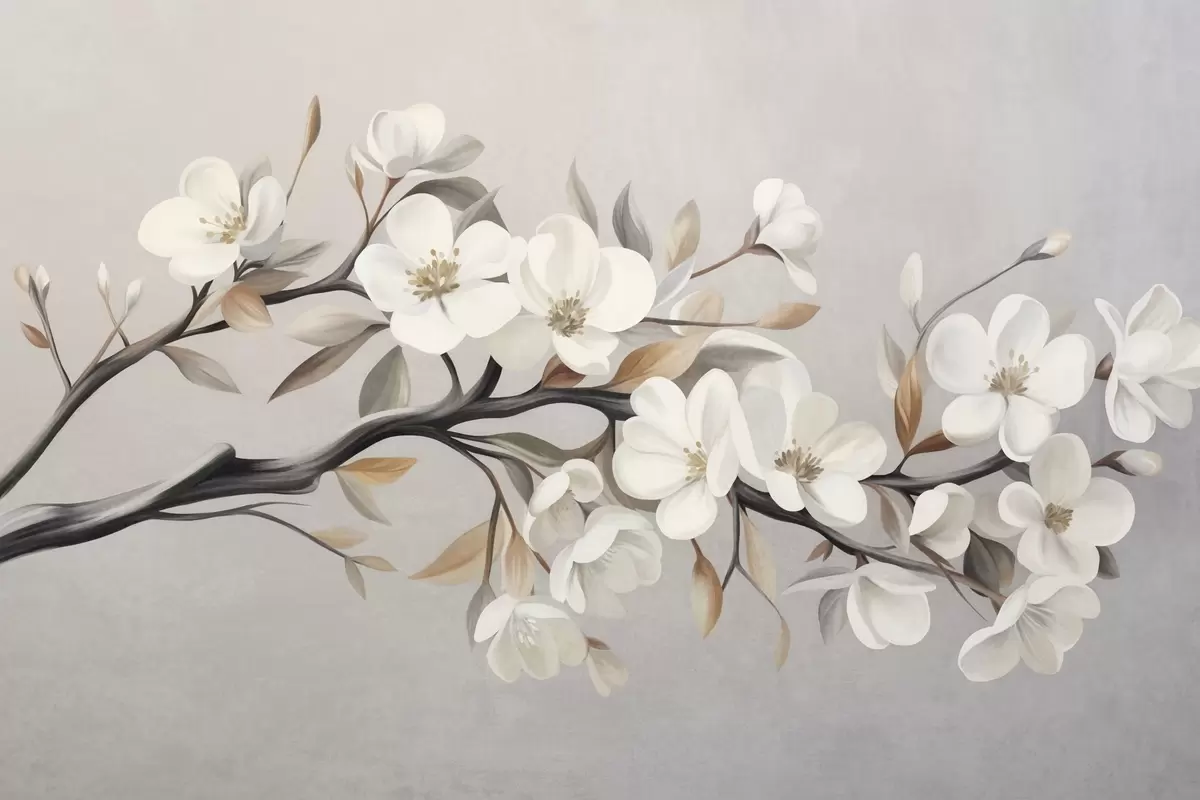 Fotobehang Een tak met structuur, witte bloemen en bruine bladeren tegen een lichtgrijze achtergrond N° w09817