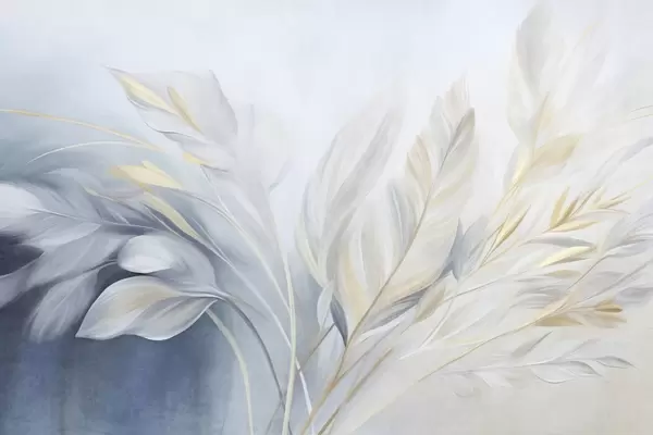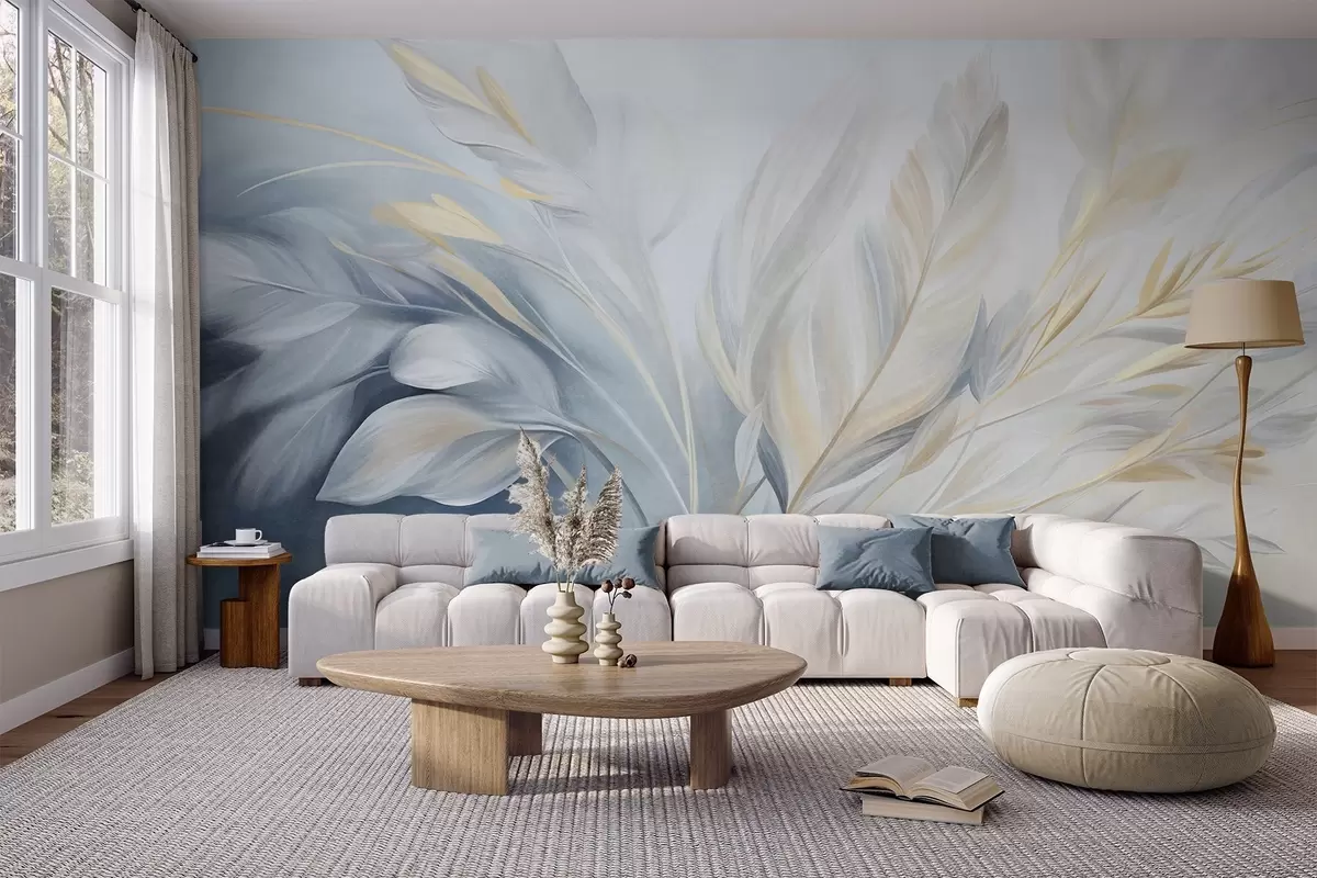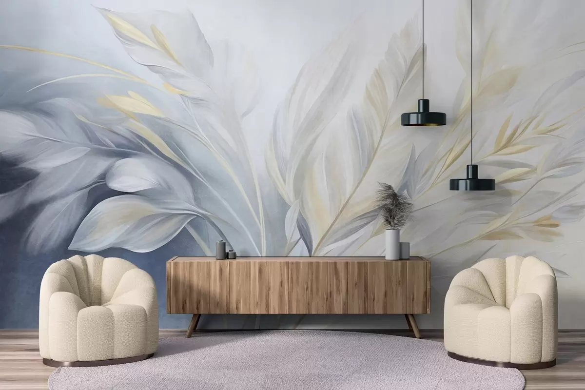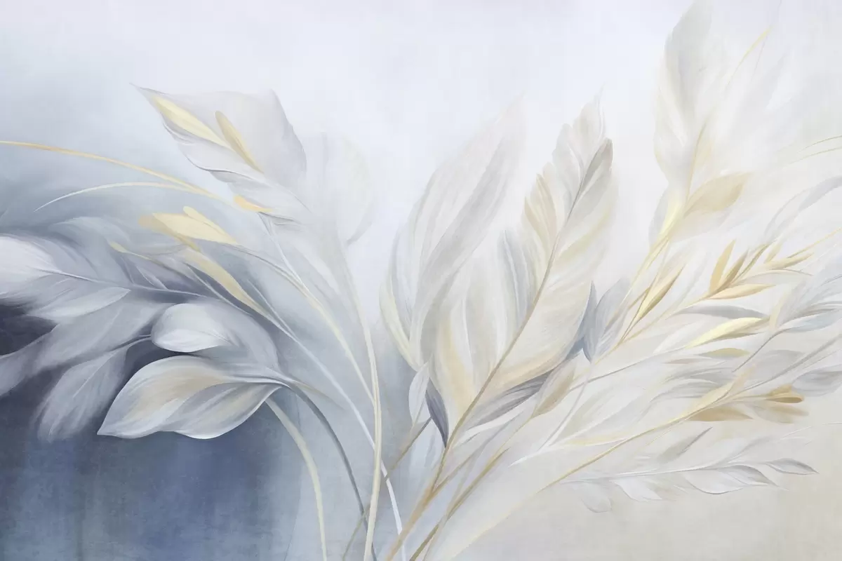 Fotobehang Veertjes met structuur en gele accenten, tegen een zachte achtergrond van lichtblauw en wit N° w09826