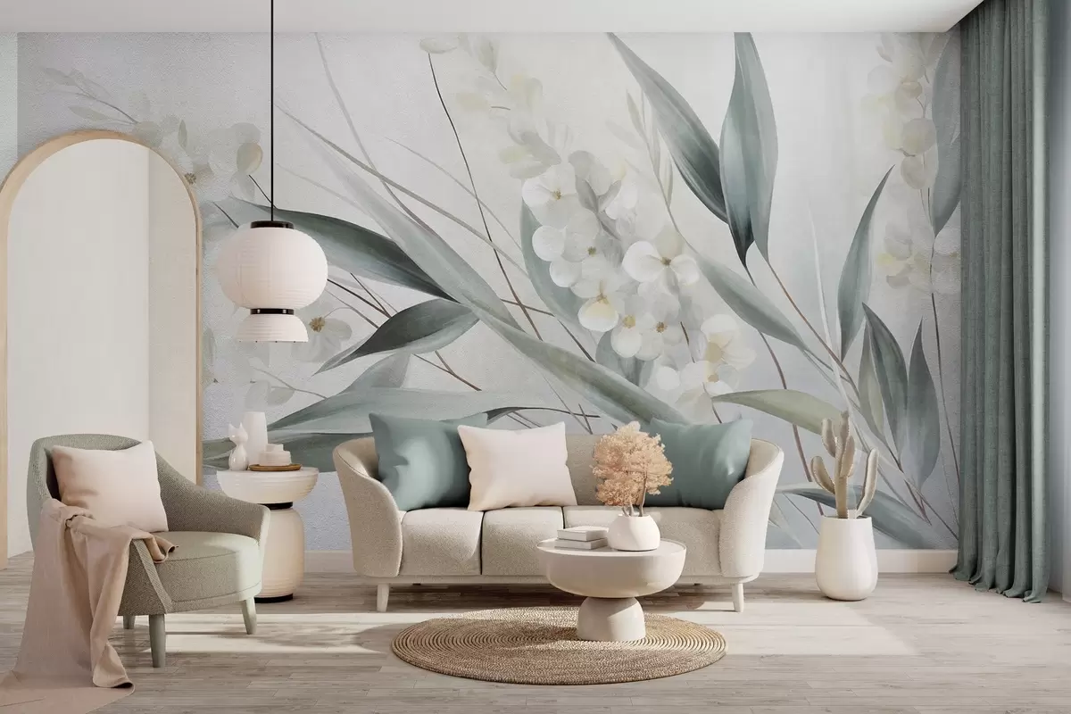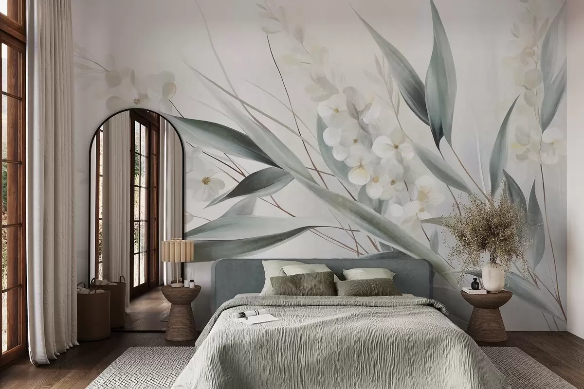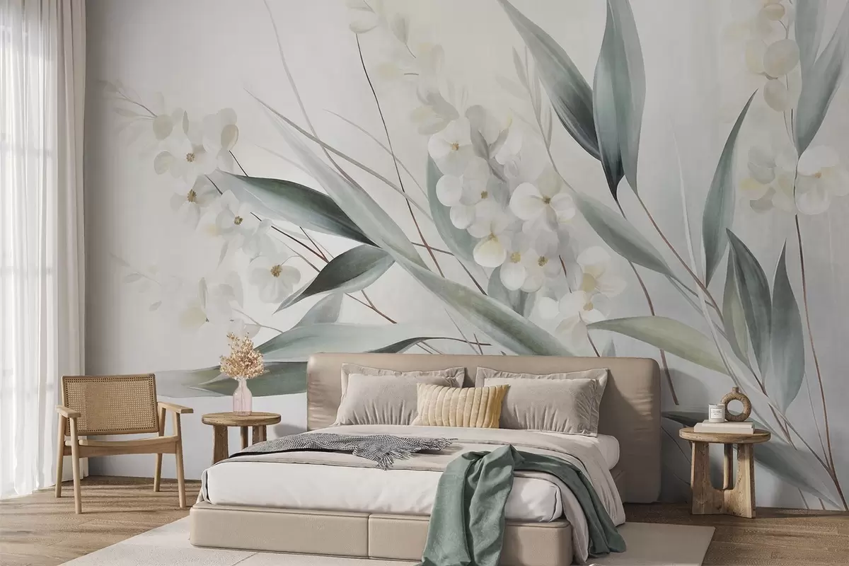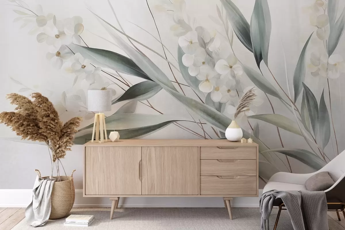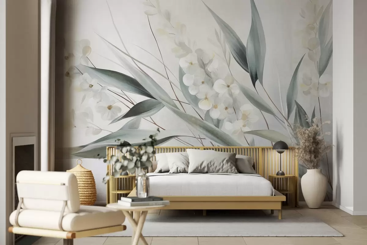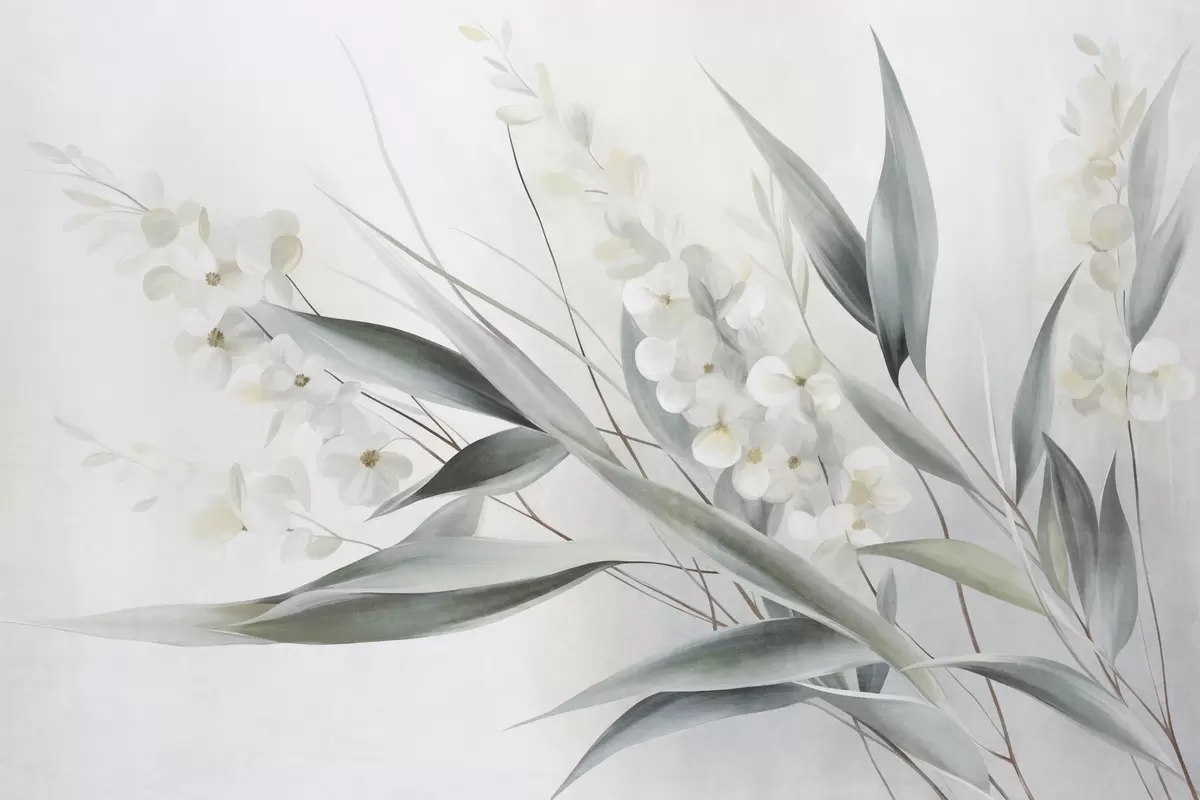 Fotobehang Verfijnde bloemen en lange groene bladeren in een schilderachtige stijl met subtiele penseelstreken, kunst met textuur N° w09827