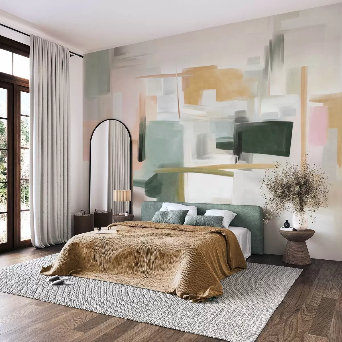 Fotobehang Een abstracte, minimalistische schilderstijl met zachte pasteltinten, geometrische vormen en lijnen N° w09828