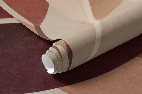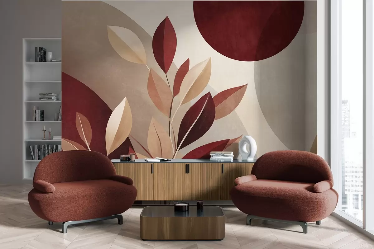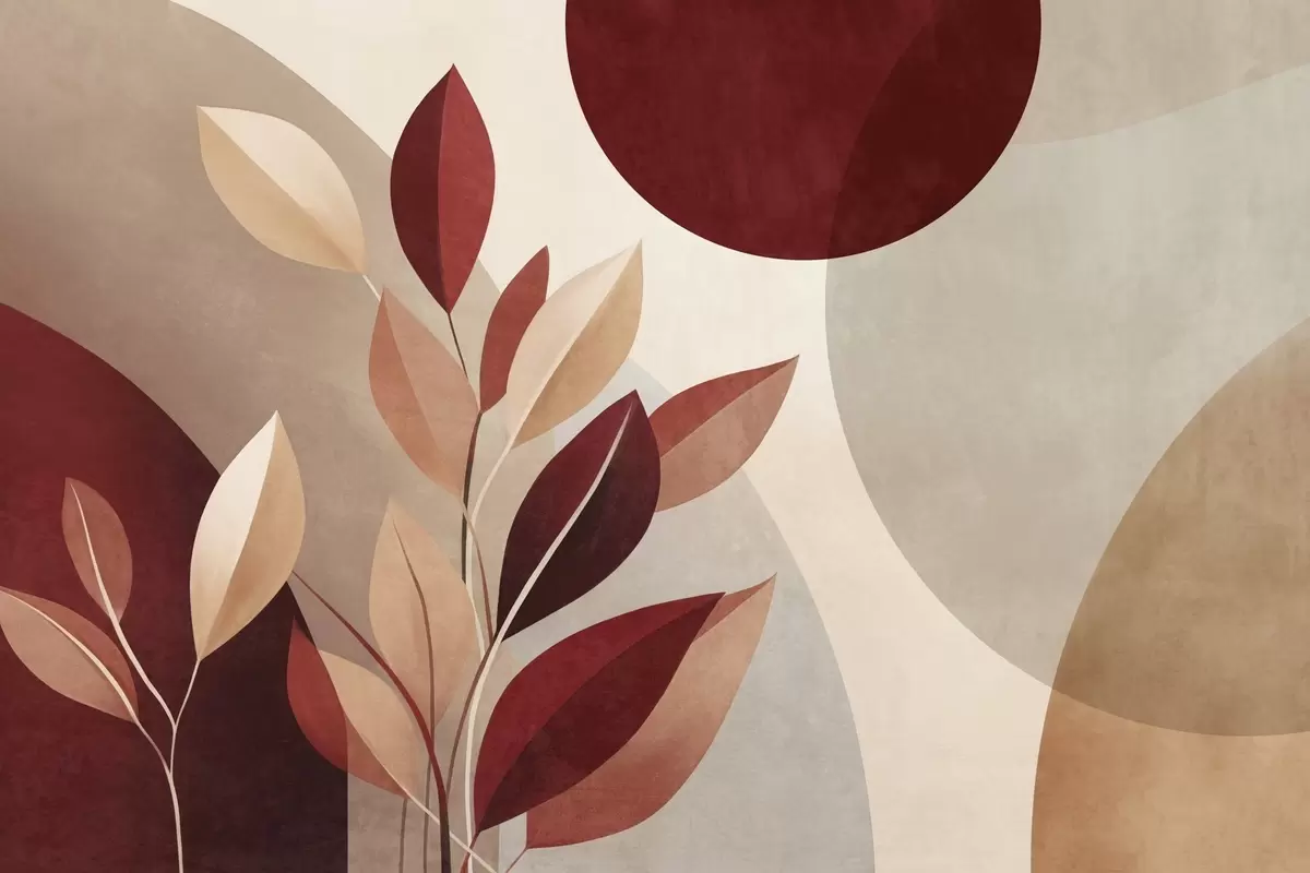 Fotobehang Bordeauxrode en beige bladeren met structuur tegen een achtergrond van abstracte vormen, minimalisme, moderne kunst N° w09829