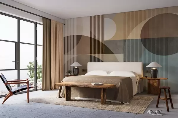 Fotobehang Abstracte geometrische vormen met cirkels en lijnen, ingetogen aardetinten, een compositie met textuur en gelaagdheid N° w09834