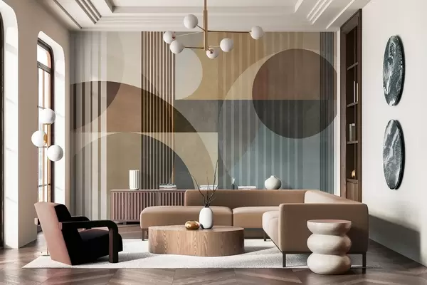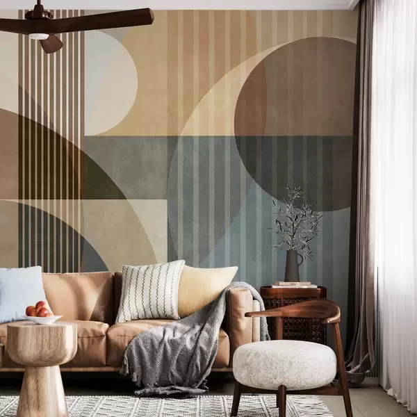 Fotobehang Abstracte geometrische vormen met cirkels en lijnen, ingetogen aardetinten, een compositie met textuur en gelaagdheid N° w09834
