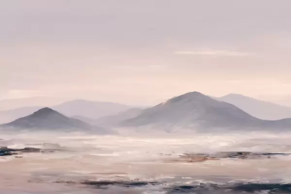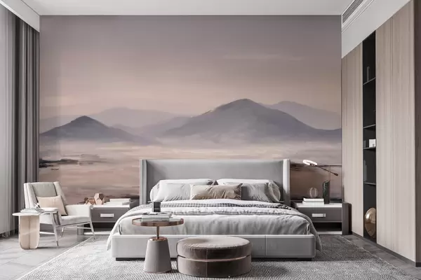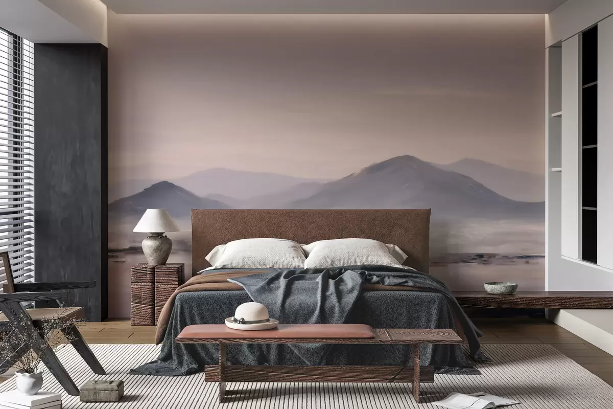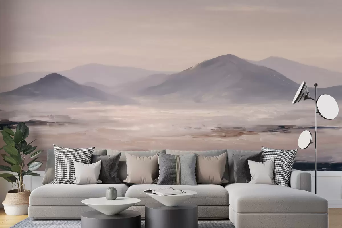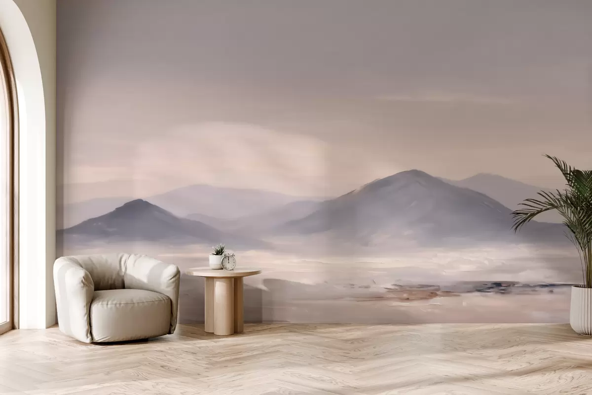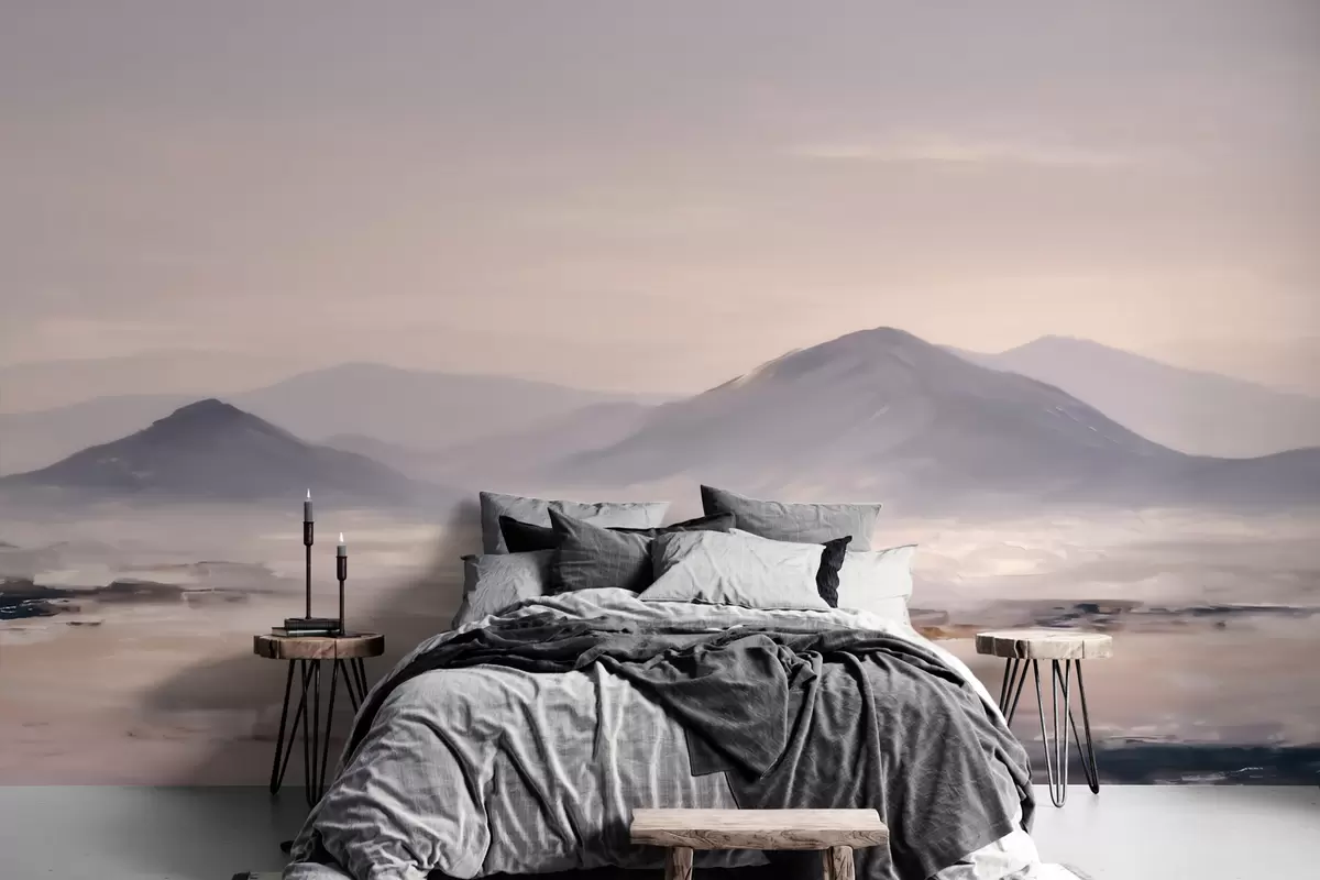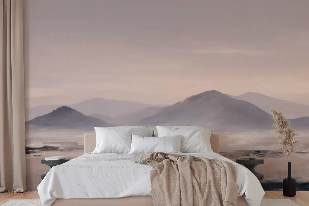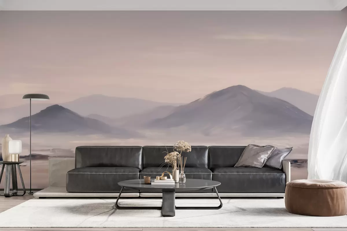 Fotobehang Een mistig berglandschap met zachte overgangen van licht en lucht, met een maskerachtig effect N° w09844