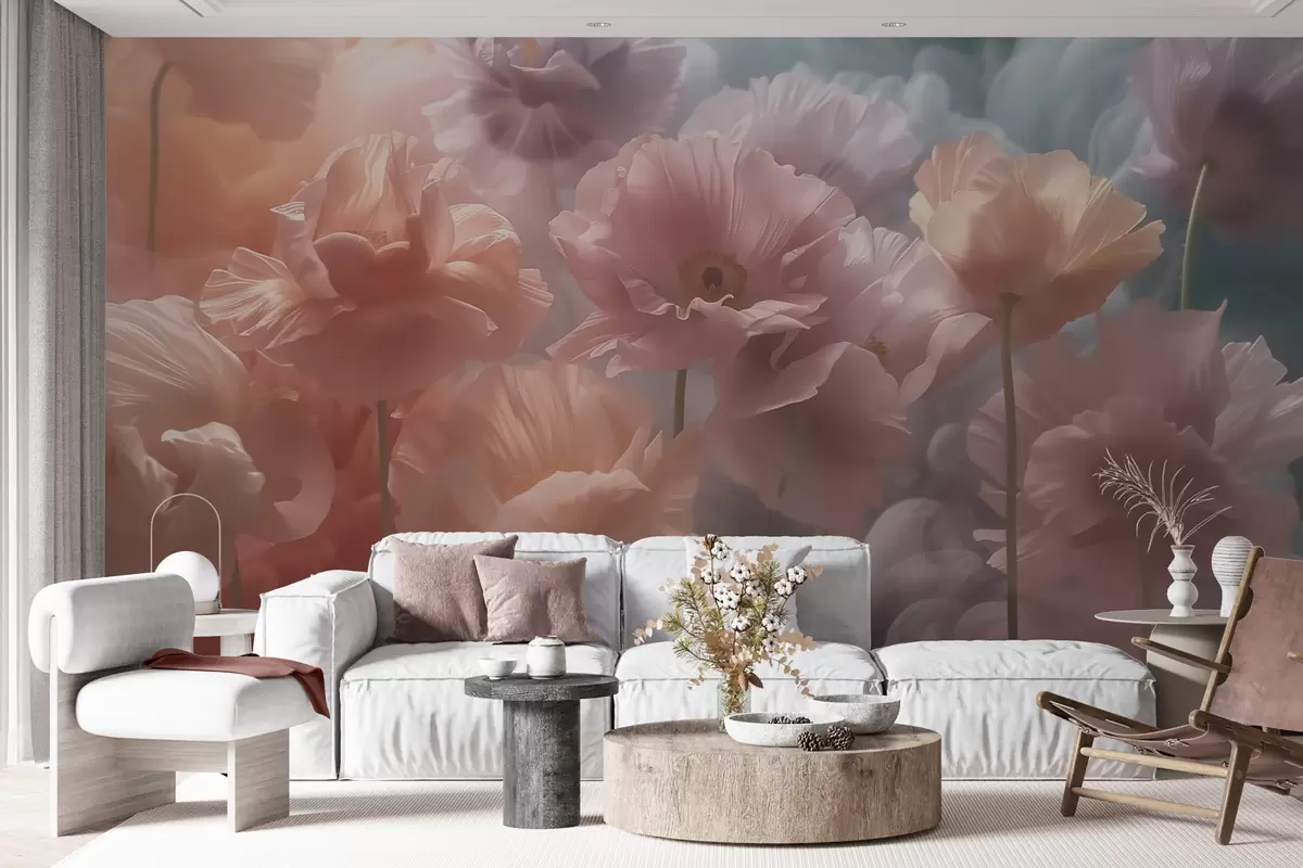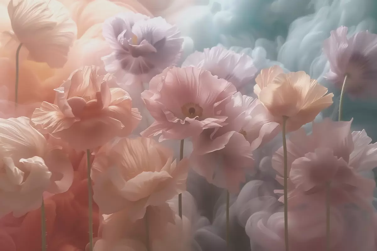 Fotobehang Luchtige bloemen met doorschijnende bloemblaadjes in het zachte ochtendlicht N° w09847
