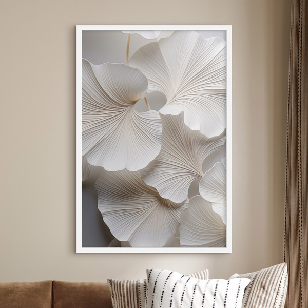 Fleurs blanches abstraites aux pétales texturés, sur fond neutre avec imitation de coups de pinceau subtils.