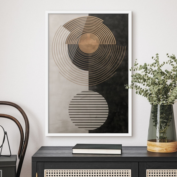 Composition géométrique abstraite avec imitation de texture bois, rectangles et cercles rouges, noirs, blancs et bleu sarcelle