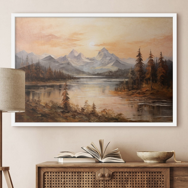 Peinture aquarelle d'un paysage imitant une forêt avec de grands pins et des montagnes en arrière-plan
