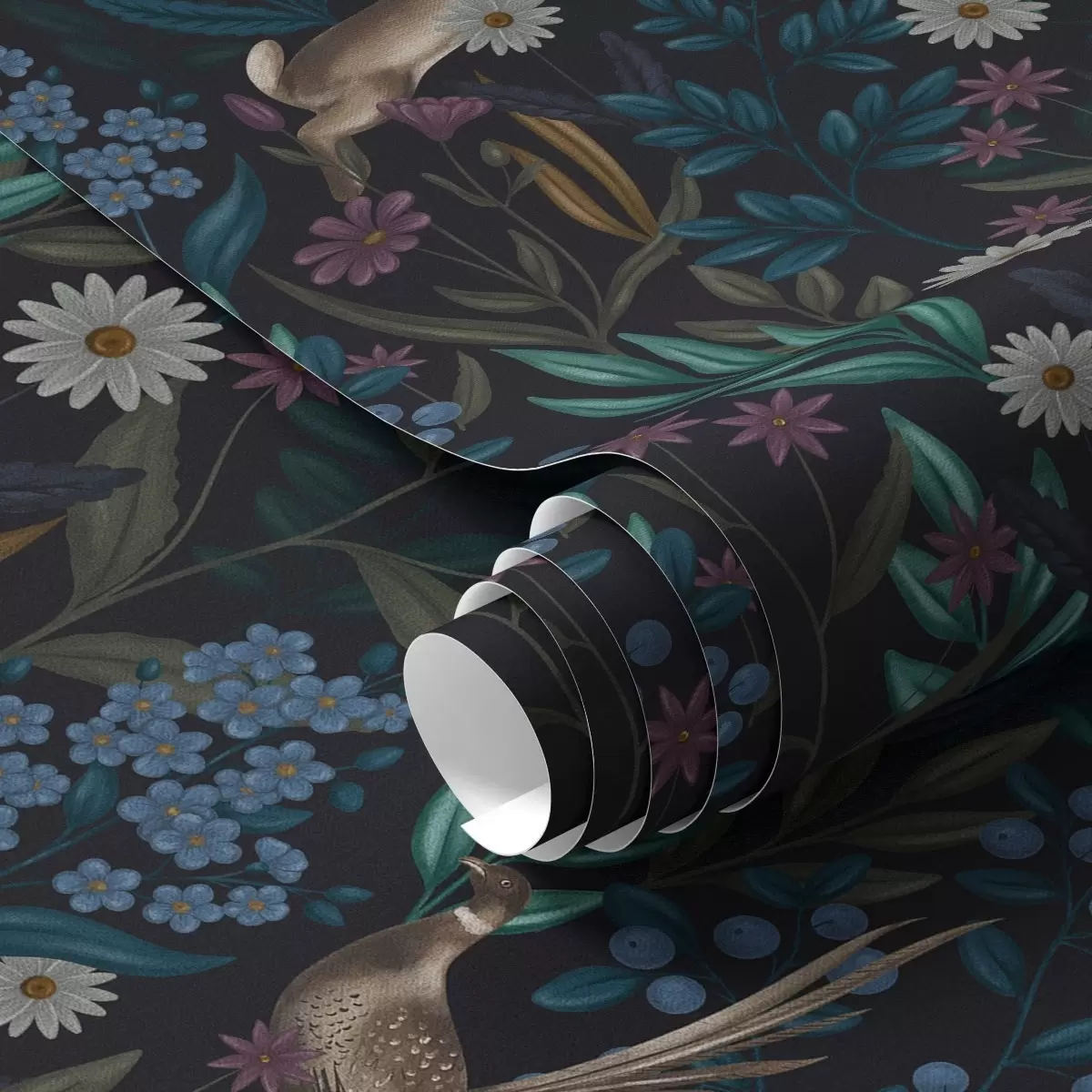 Fonds d'écran Forêt sombre avec des fleurs, un lièvre et un oiseau Nr. a00310