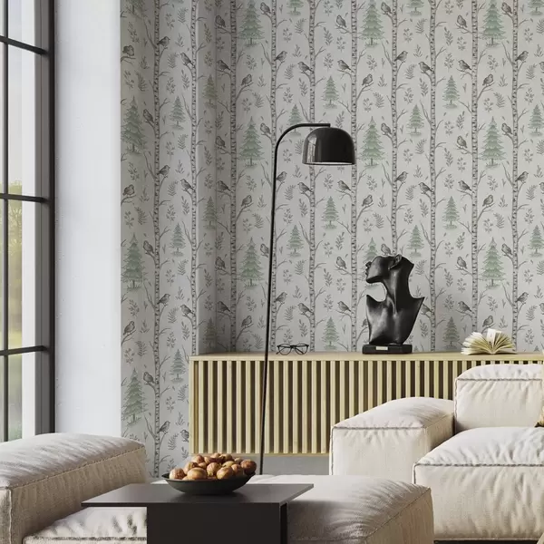 Fonds d'écran Bouleaux avec oiseaux dans une forêt vert clair Nr. a00316