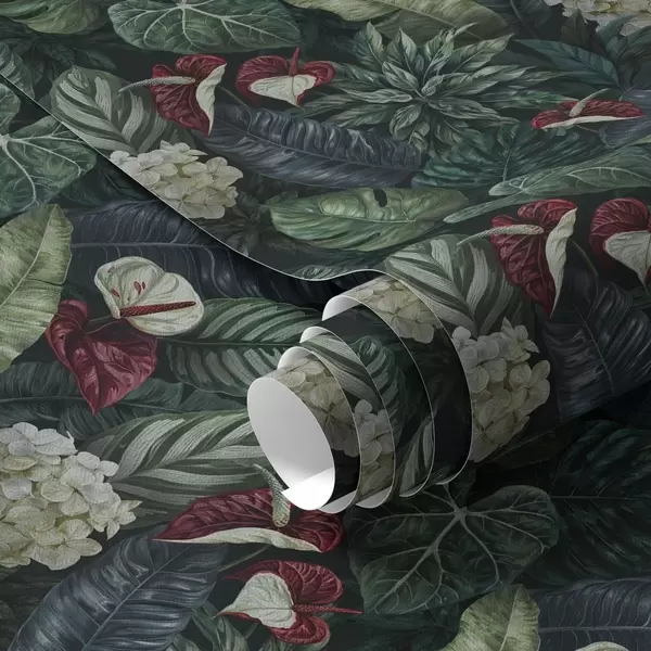 Fonds d'écran Feuilles tropicales avec fleurs blanches et rouges Nr. a00361