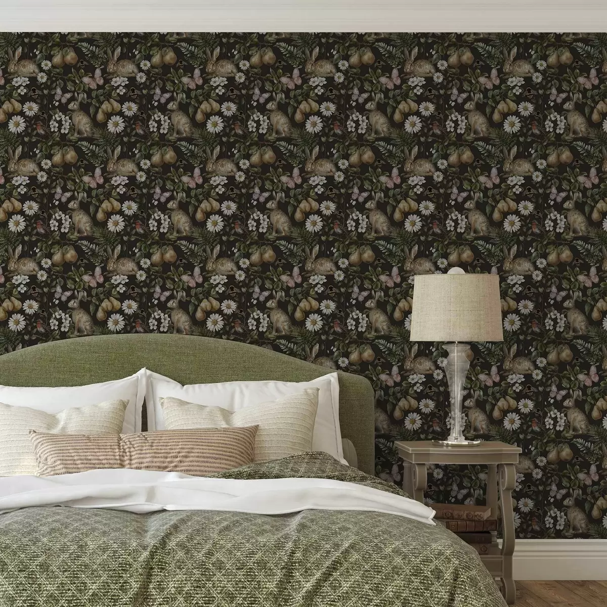 Fonds d'écran Lapins, poires, fleurs et insectes réalistes sur fond sombre Nr. a00401