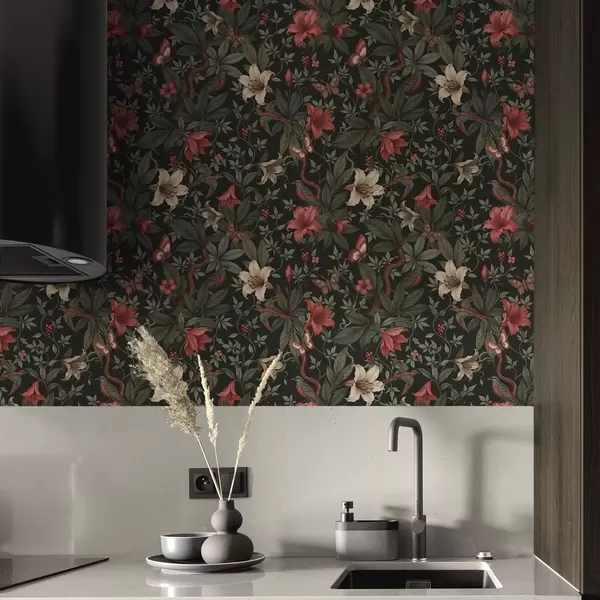 Fonds d'écran Motifs floraux sombres de la jungle avec des oiseaux et des papillons Nr. a00895