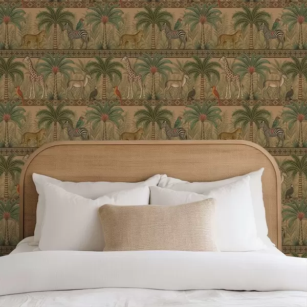 Papier peint Animaux décoratifs de la savane entre palmiers et bordures a00898