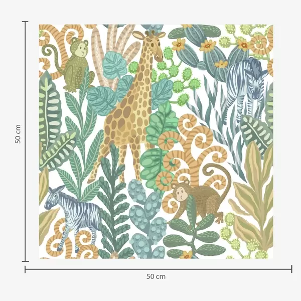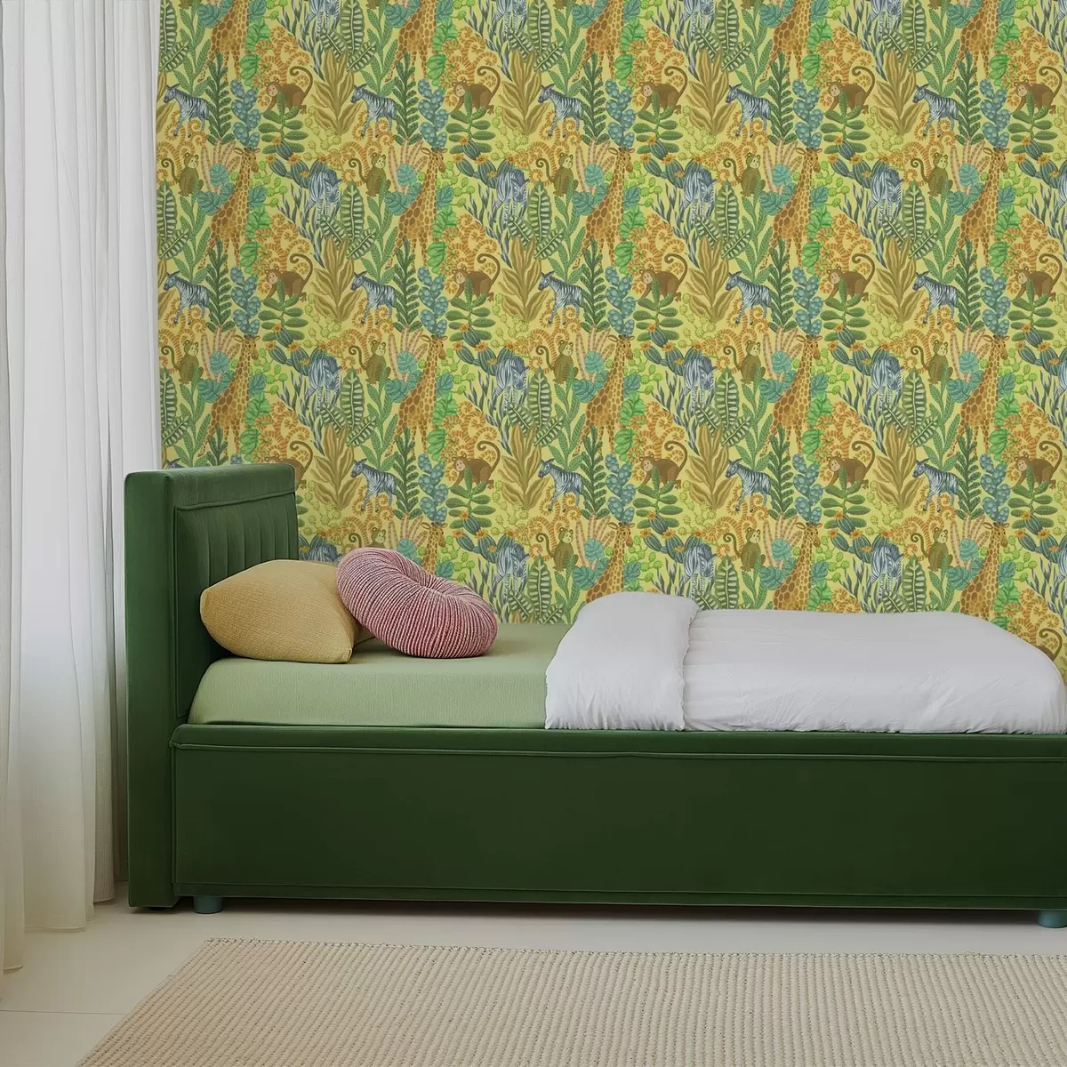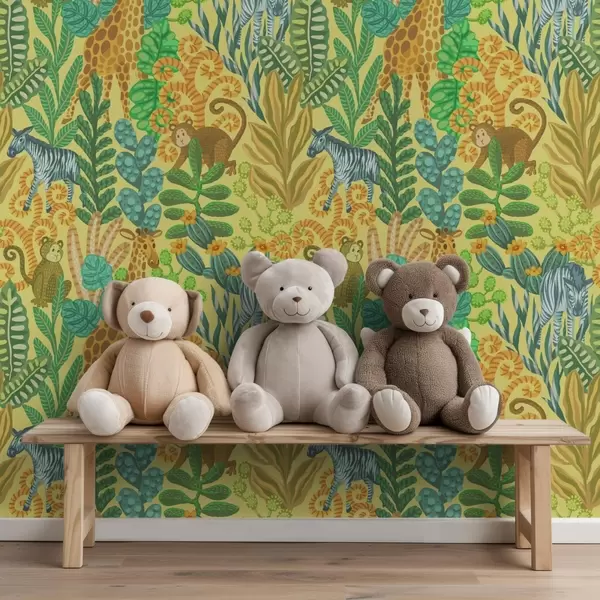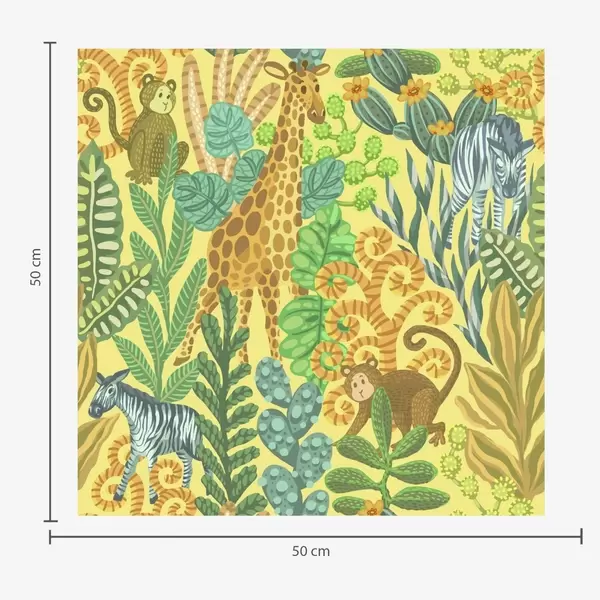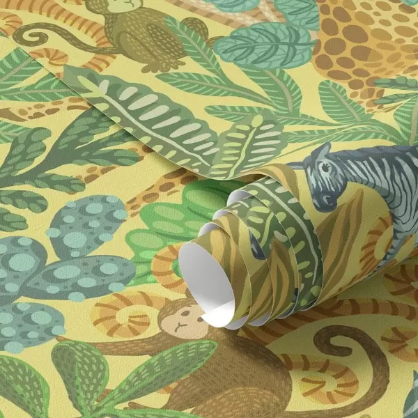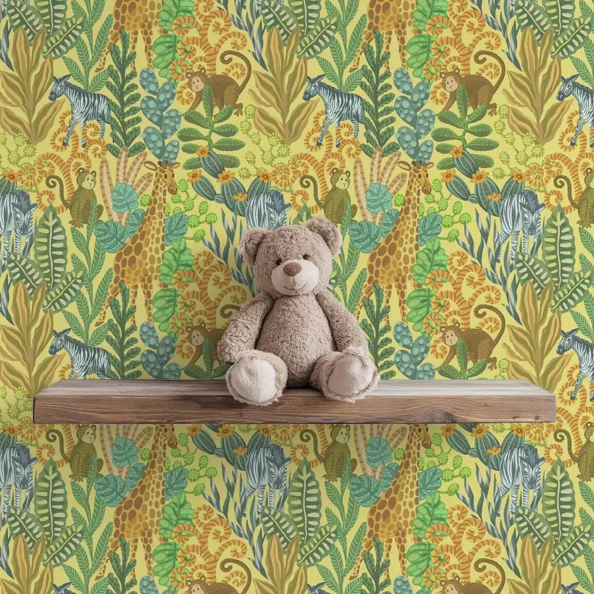Fonds d'écran Girafe, zèbre et singe dans une savane jaune vif Nr. a01000v1