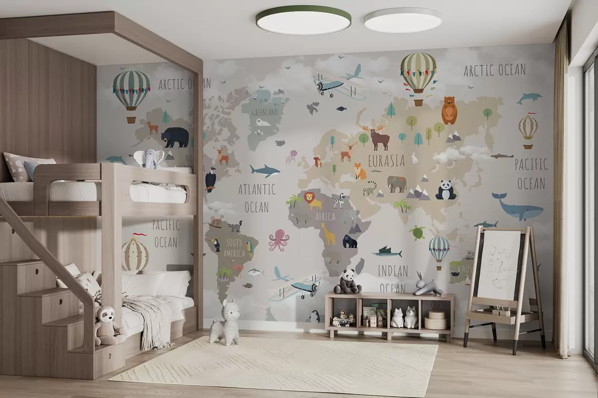 Papier peint photo Carte du monde avec animaux et ballons N° u96461