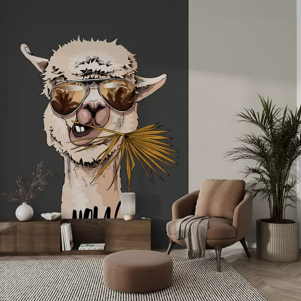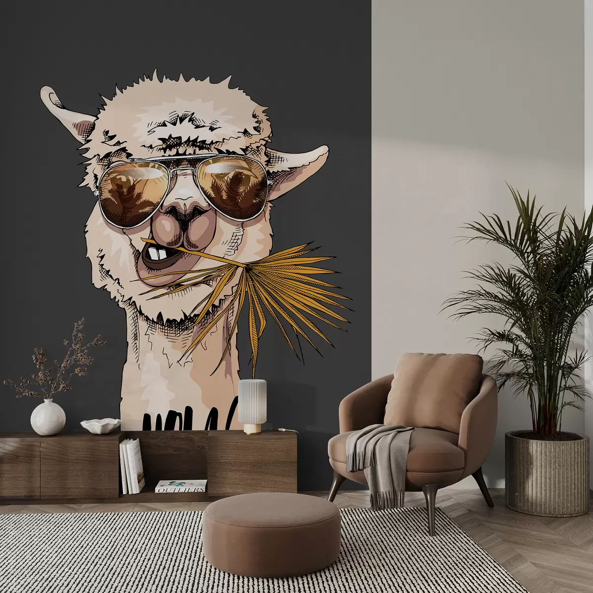 Papier peint photo Portrait d'un lama portant des lunettes de soleil avec un éventail de feuilles de palmier N° u98177v1