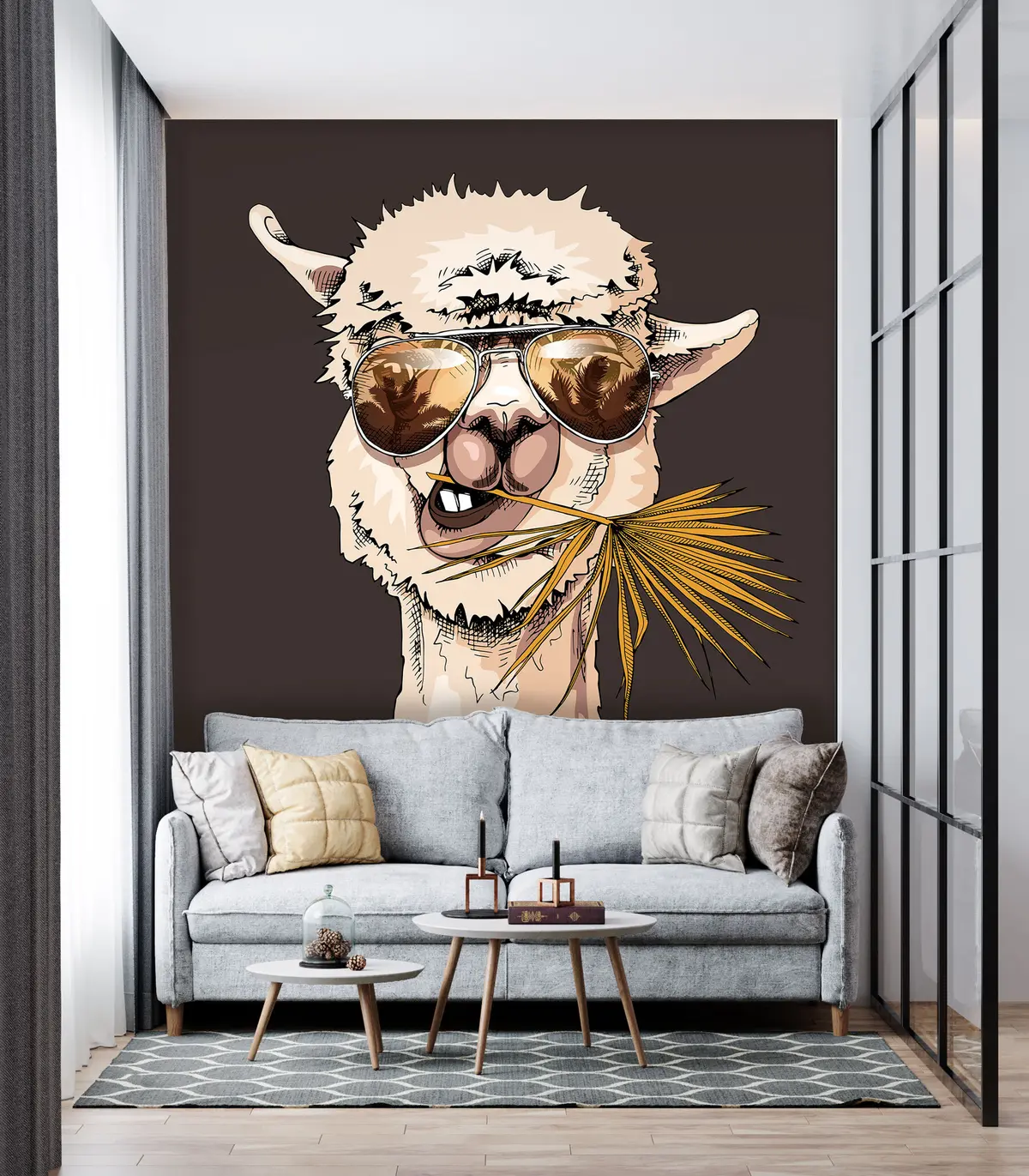 Papier peint photo Portrait d'un lama portant des lunettes de soleil avec un éventail de feuilles de palmier N° u98177v2