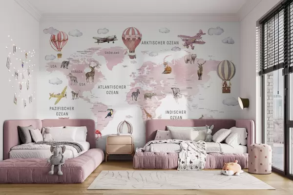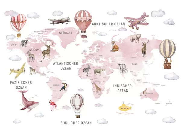 Papier peint photo Carte pour enfants au style aquarelle avec des animaux et des montgolfières. En allemand. Couleur rose N° c00001dev3