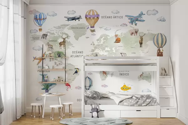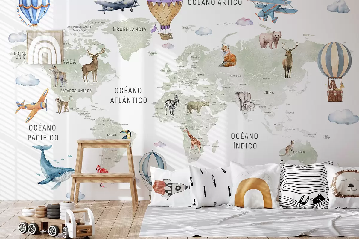 Papier peint photo Carte pour enfants au style aquarelle avec des animaux et des montgolfières. En espagnol. Couleur verte. N° c00001es