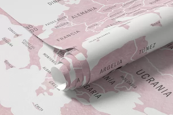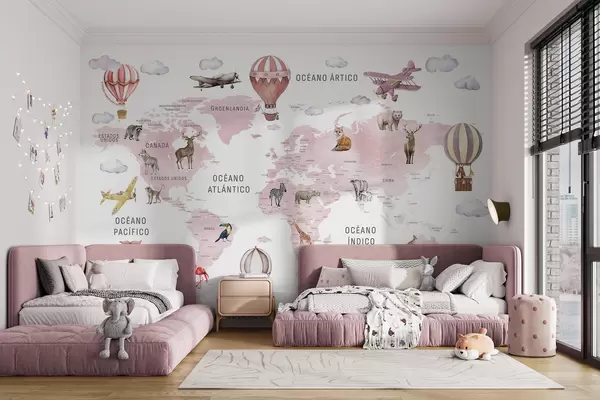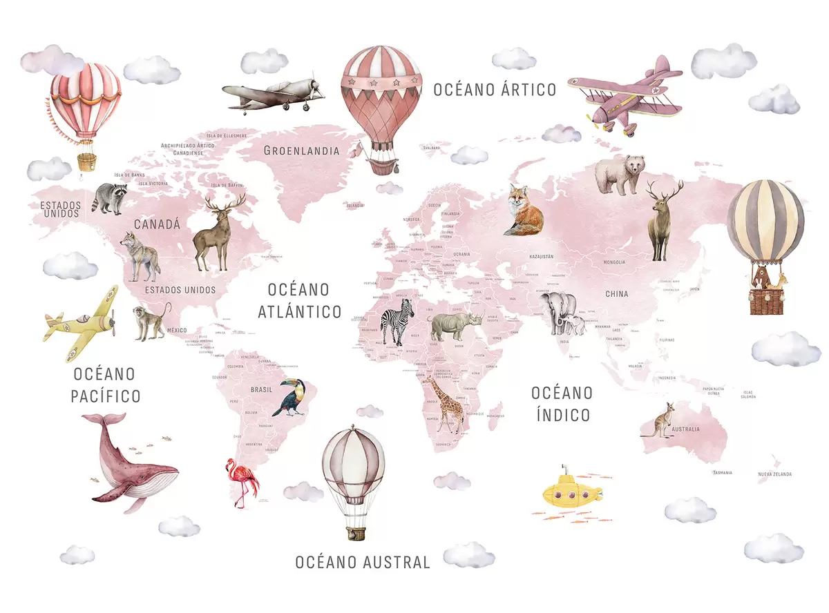 Papier peint photo Carte pour enfants au style aquarelle avec des animaux et des montgolfières. En espagnol. Couleur rose. N° c00001esv3
