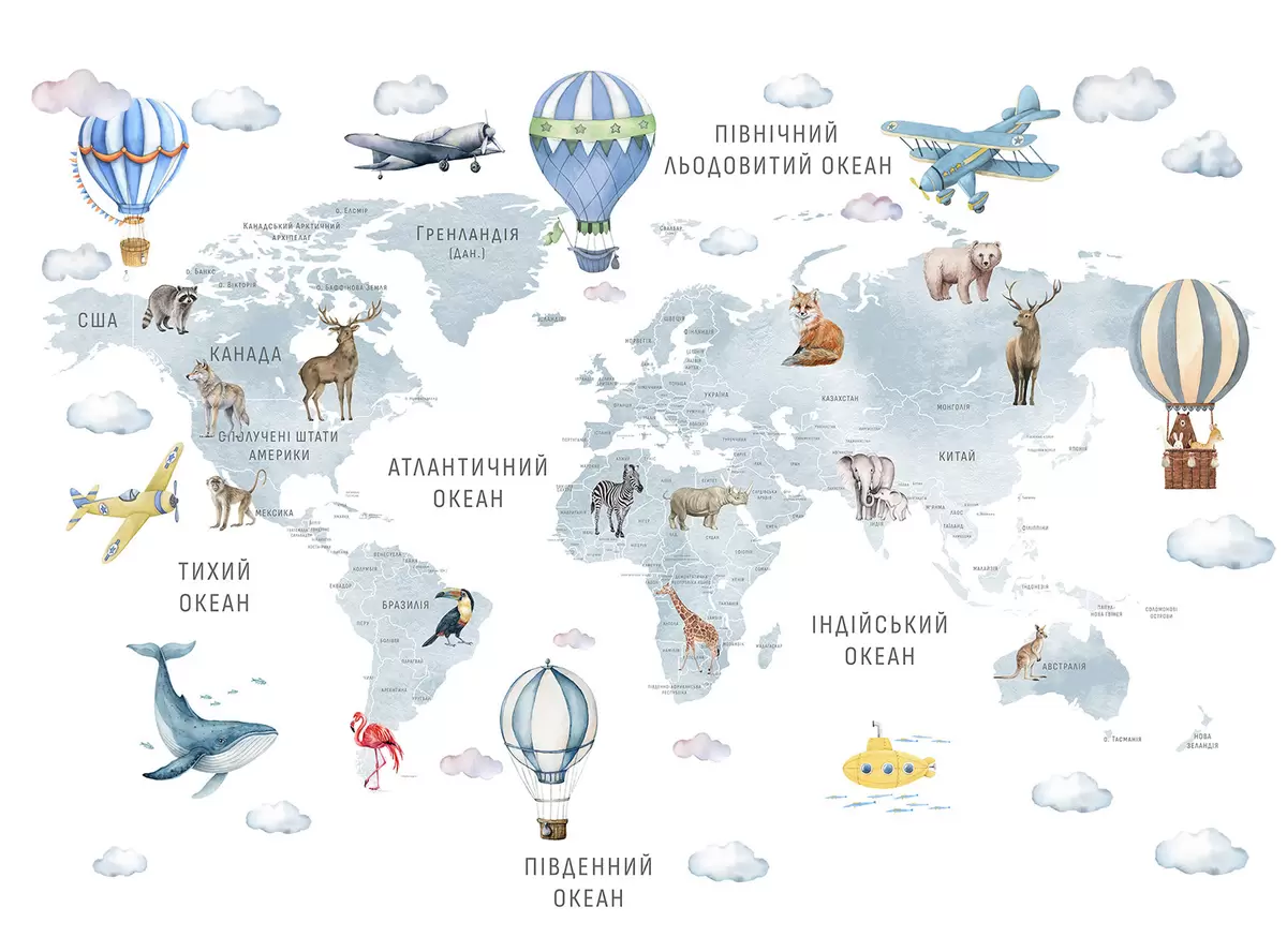 Papier peint photo Carte pour enfants au style aquarelle avec des animaux et des montgolfières. En ukrainien. Couleur bleue. N° c00001ukv1