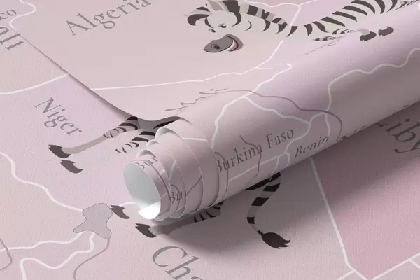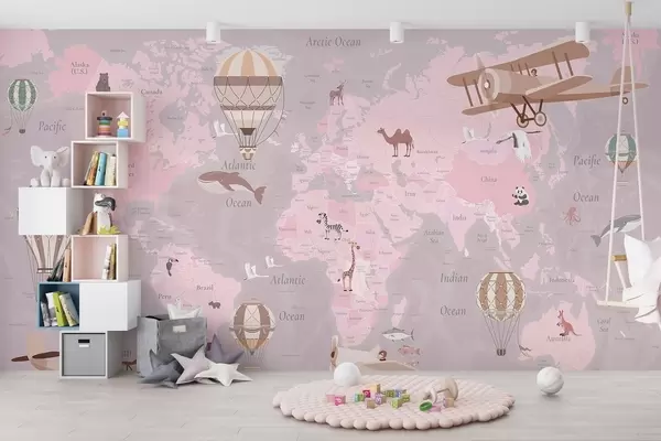 Papier peint photo Carte du monde pour enfants avec des animaux, des avions et des montgolfières. En anglais. Couleur rose N° c00003env3