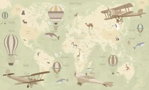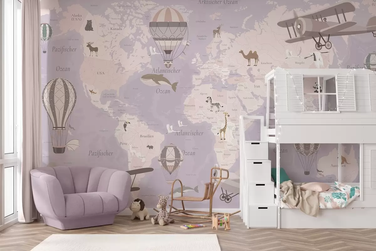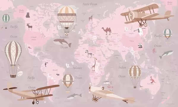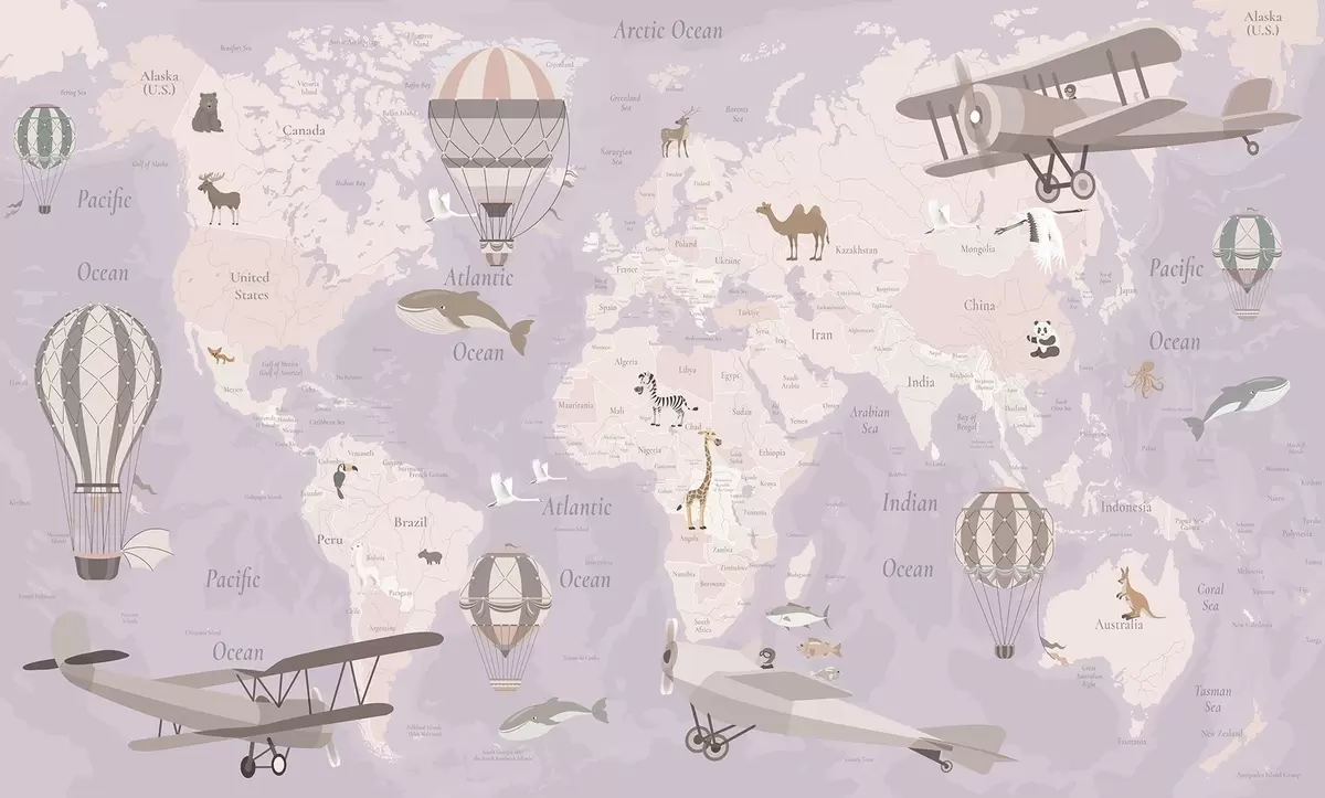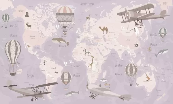 Papier peint photo Carte du monde pour enfants avec des animaux, des avions et des montgolfières. En anglais. Couleur violette. N° c00003env4