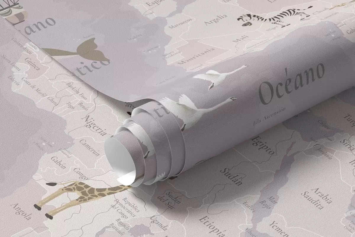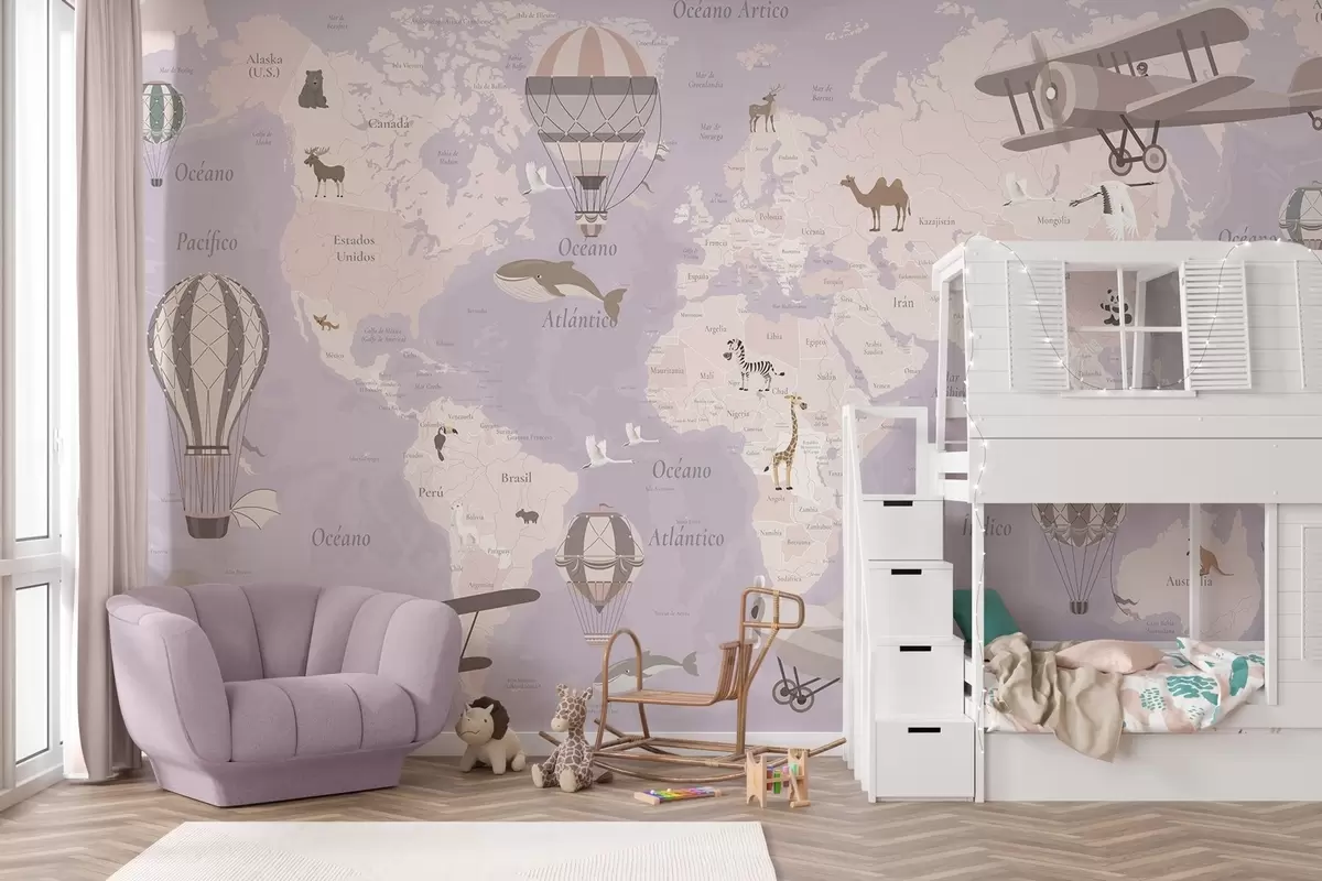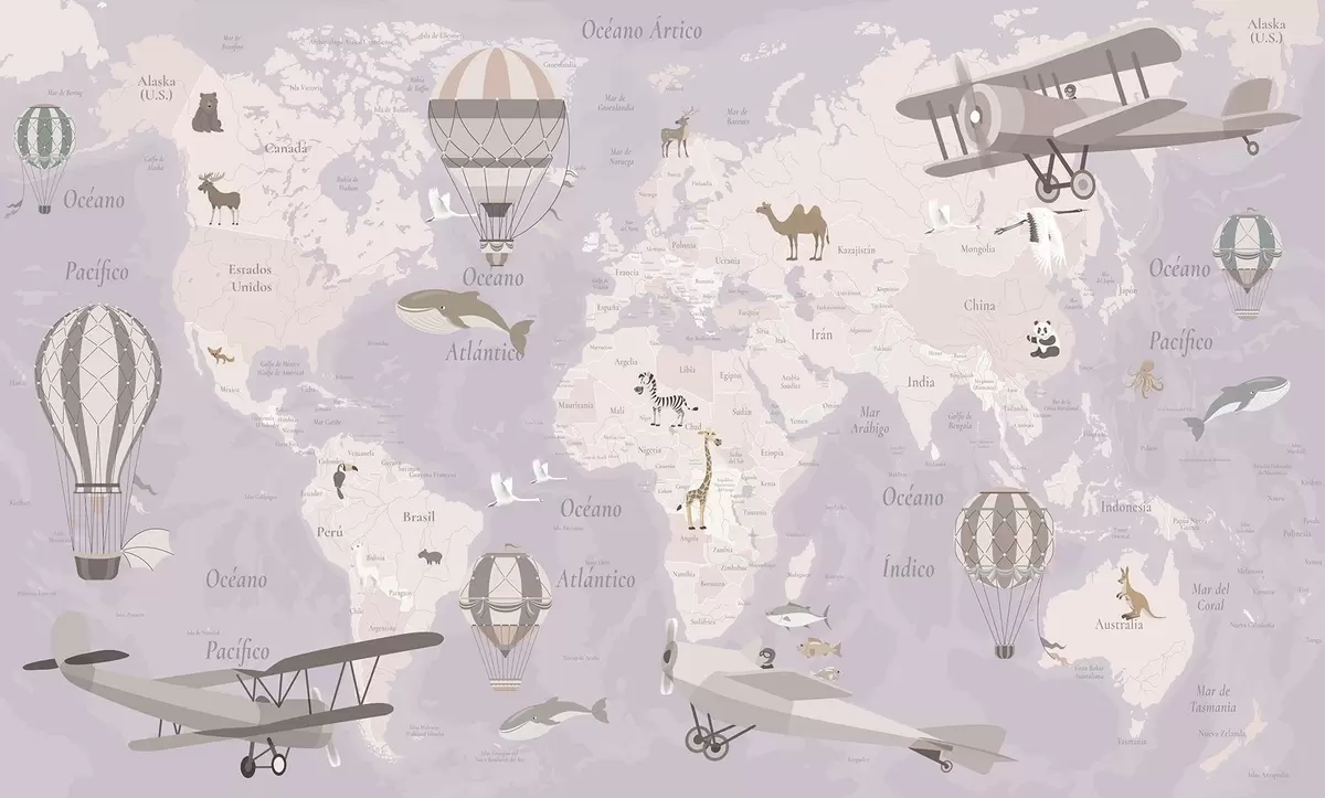 Papier peint photo Carte du monde pour enfants avec des animaux, des avions et des montgolfières. En espagnol. Couleur violette N° c00003esv4