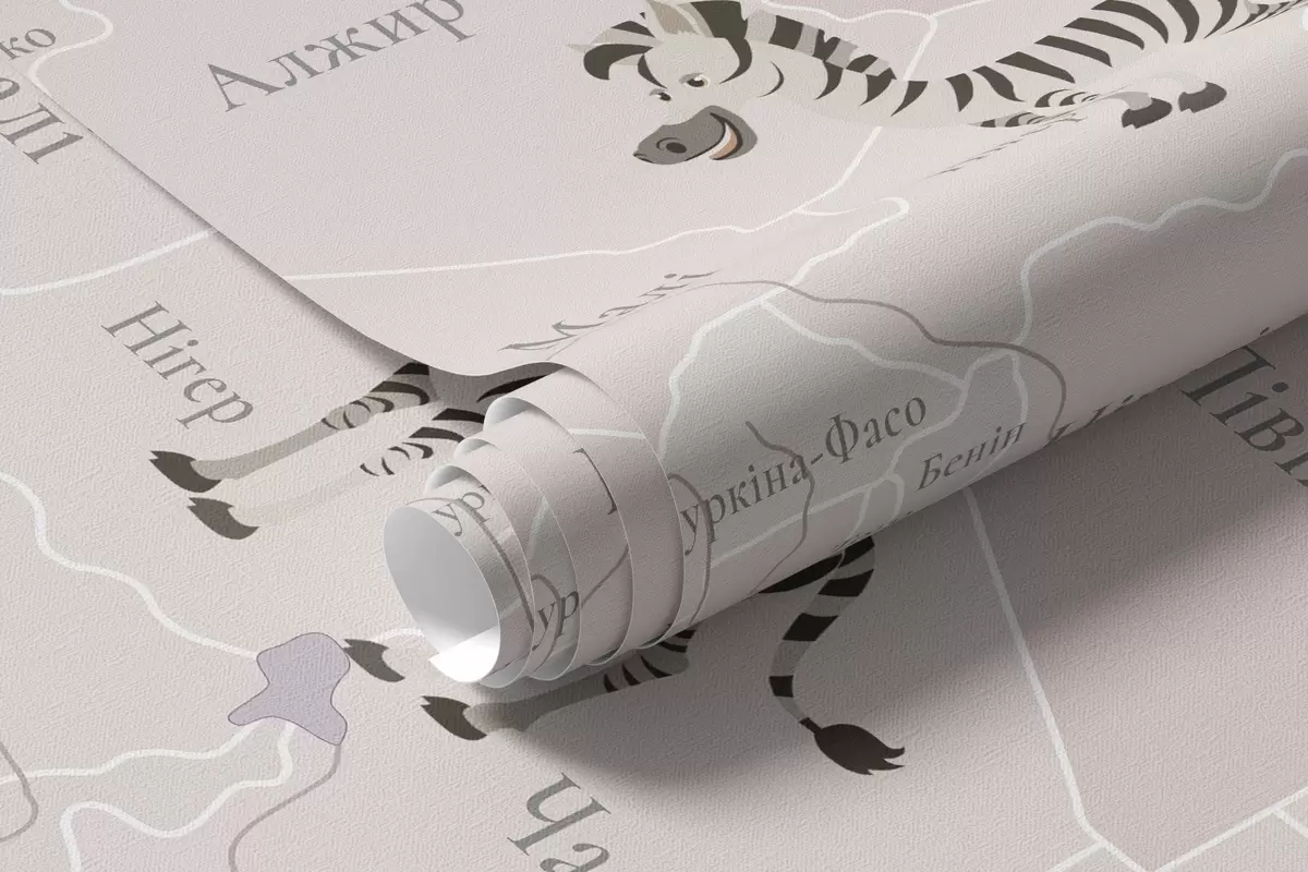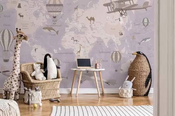 Papier peint photo Carte du monde pour enfants avec des animaux, des avions et des montgolfières. En ukrainien. Couleur violette N° c00003ukv4