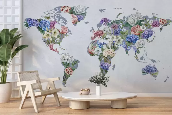 Papier peint photo Une carte du monde colorée, composée d'une variété de fleurs aux couleurs vives N° c00006