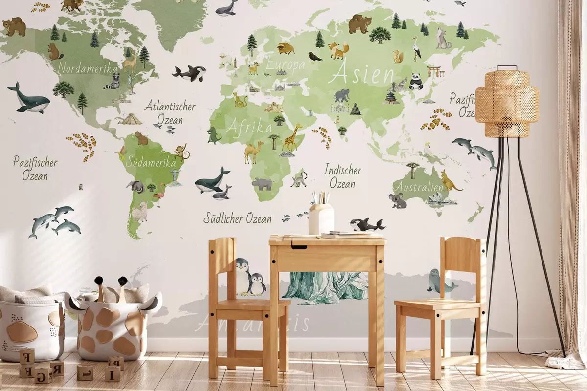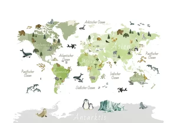 Papier peint photo Une carte verte de style aquarelle représentant des animaux, des plantes et des bâtiments. Légendes en allemand N° c00009dev2