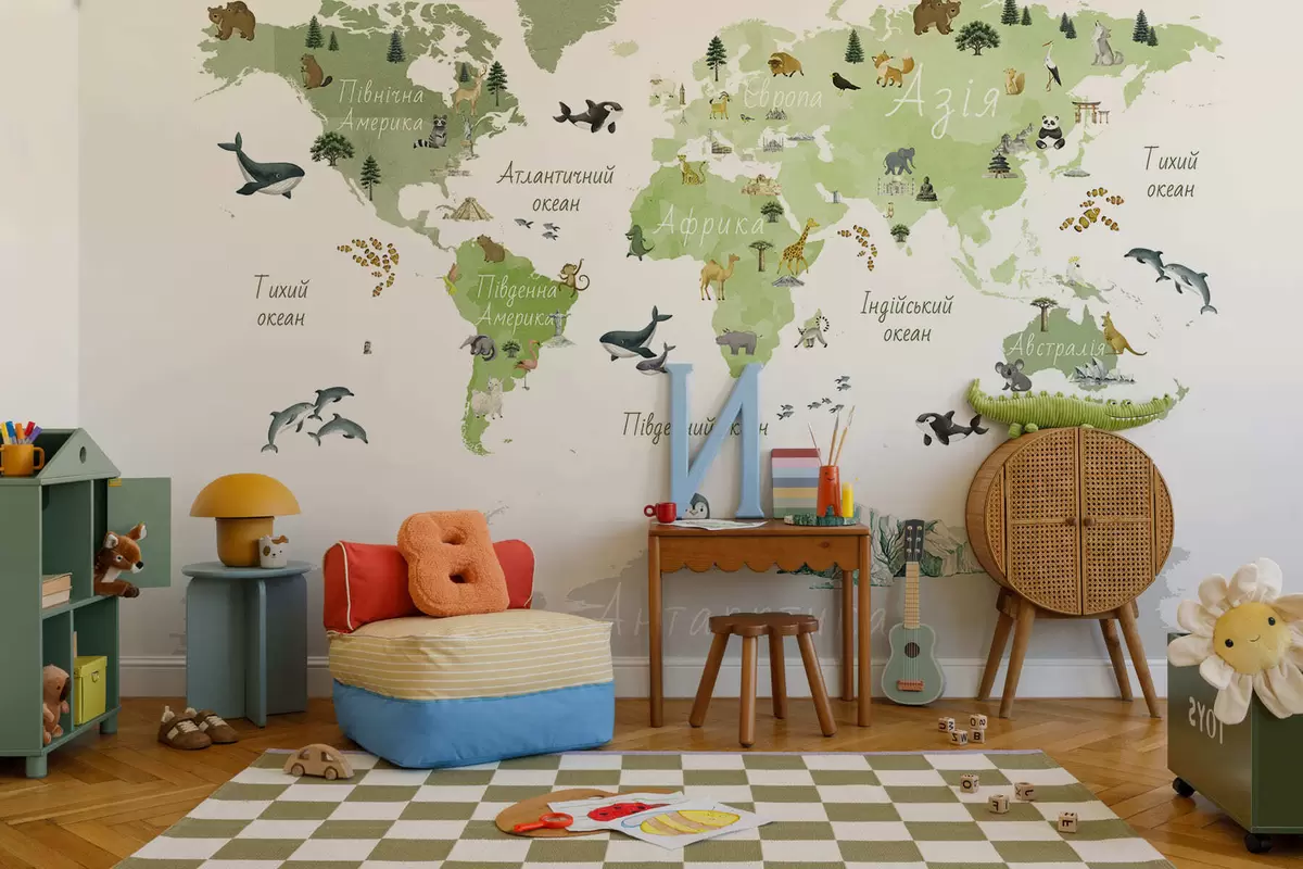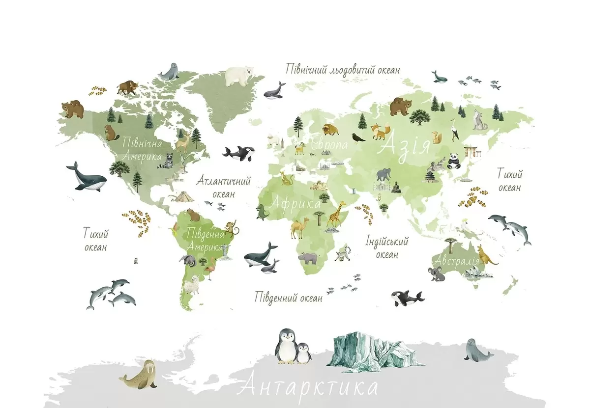 Papier peint photo Une carte verte de style aquarelle représentant des animaux, des plantes et des bâtiments. Légendes en ukrainien N° c00009ukv2