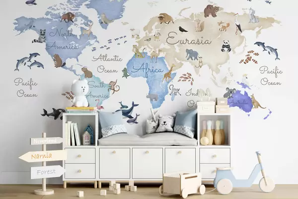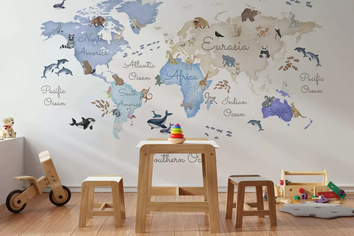 Papier peint photo Une carte bleue de style aquarelle représentant des animaux. Légendes en anglais N° c00012env1