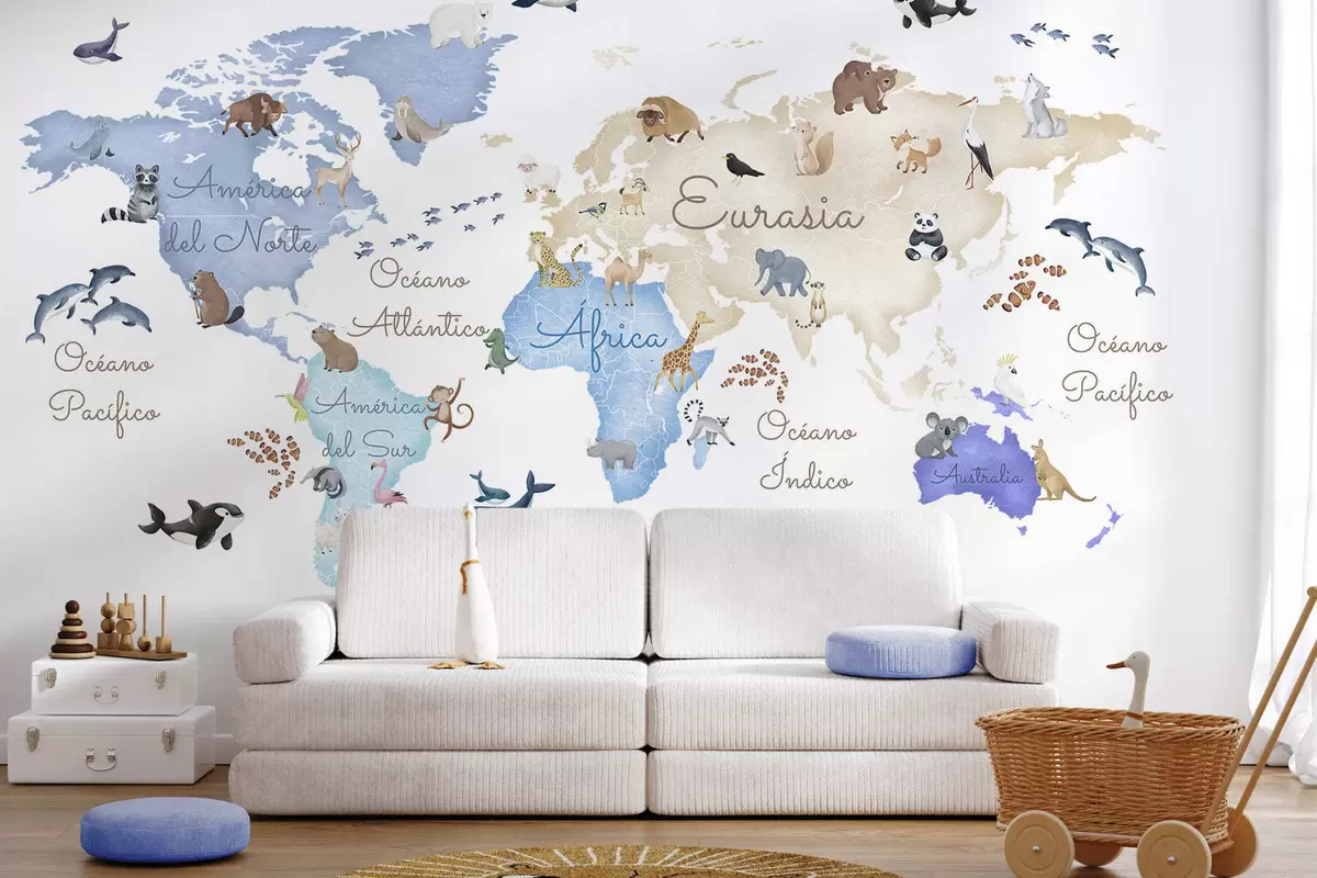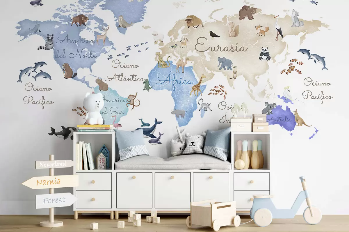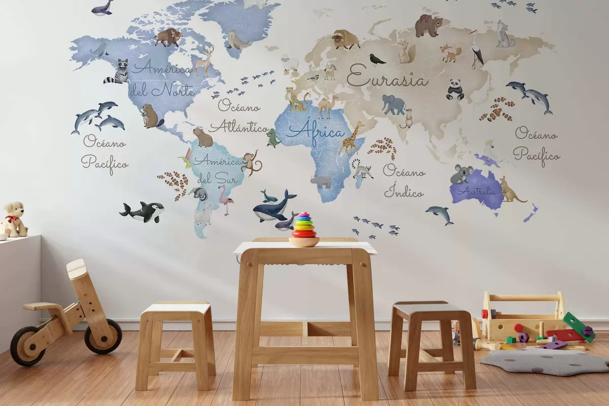 Papier peint photo Une carte bleue de style aquarelle représentant des animaux. Légendes en espagnol N° c00012esv1