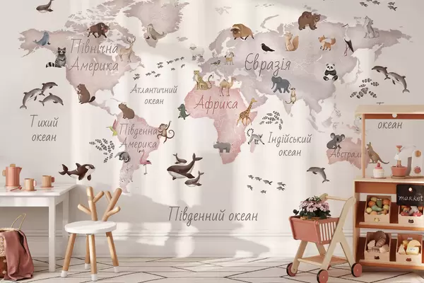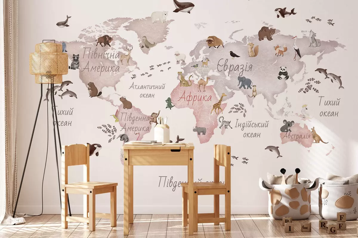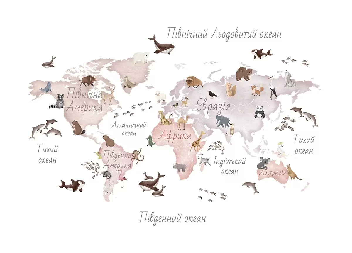 Papier peint photo Une carte de couleur beige, de style aquarelle, représentant des animaux. Légendes en ukrainien N° c00012ukv3