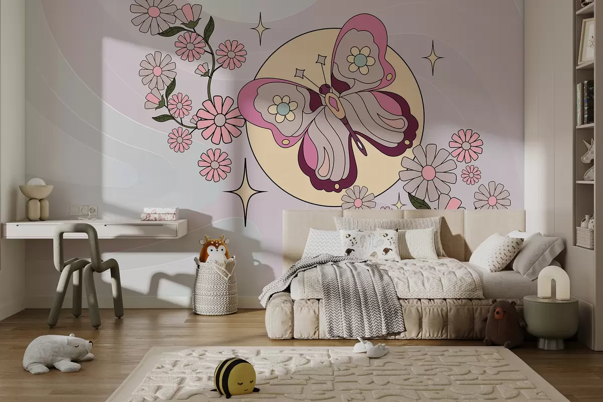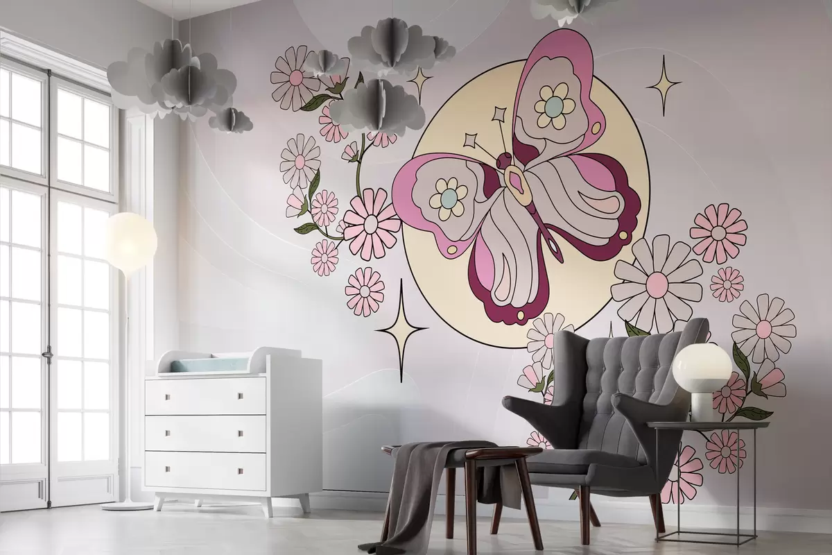 Papier peint photo papier peint avec un papillon rose sur un fond gris-rose clair parmi des fleurs dans un style simple pour une chambre de fille N° w00985